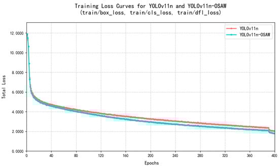 The selection of these hyperparameters was based on established practices for training YOLO models, recommendations from the relevant literature [,], and constraints on our computational resources. The SGD optimizer with an initial learning rate of 0.001 is a standard configuration known for its stability in object detection tasks. The batch size was maximized within the memory limits of our GPU (NVIDIA GeForce RTX 5000, NVIDIA Corporation, Santa Clara, California, United States of America) to ensure efficient hardware utilization. The momentum and weight decay values are conventional defaults that aid convergence and regularization, respectively. The number of epochs (400) was chosen to ensure the loss values of all compared models stabilize fully and to ensure fair comparisons. While a comprehensive hyperparameter search was not the primary focus, limited preliminary runs were conducted to verify the stability of this setup. Keeping these core hyperparameters consistent across all experiments was a deliberate choice to isolate and accurately evaluate the performance impact of the proposed architectural modifications.
