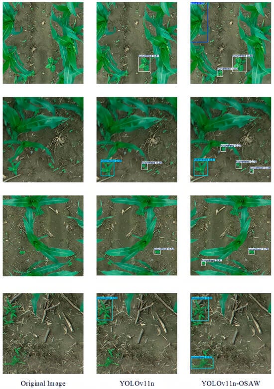 These results verify that the YOLOv11n-OSAW model strikes an optimal balance between detection performance and computational efficiency, thus meeting the requirements for real-time weed detection in maize fields via UAV platforms.