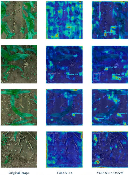 To clearly demonstrate the performance advantages of the improved model, a visual comparison was conducted from two perspectives: detection results and response heatmaps. Two representative images of maize field weeds were selected for experimentation. Detection was performed using both the original YOLOv11n baseline model and the improved YOLOv11n-OSAW model, with the results presented in Figure 11.