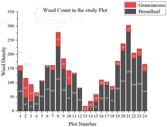 Weed population statistics for each experimental plot. The gray and red bars represent the number of gramineous and broadleaf weeds identified in each plot, respectively. This quantitative analysis of weed density per plot provided the basis for determining the tiered application strategy and corresponding herbicide dosage.