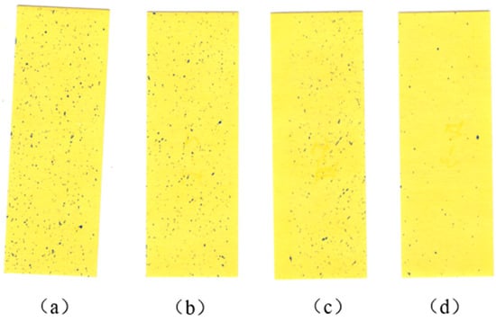 Figure 16a–d displays representative water-sensitive paper samples collected from test plots under different application levels: (a) 100% (30 L/mu), (b) 85% (25.5 L/mu), (c) 70% (21 L/mu), and (d) 50% (15 L/mu) of the conventional application rate, respectively. The visible gradation in droplet density across these subfigures qualitatively corroborates the quantitative trends observed in Figure 17, confirming the drone’s capability for precise prescription-based application.