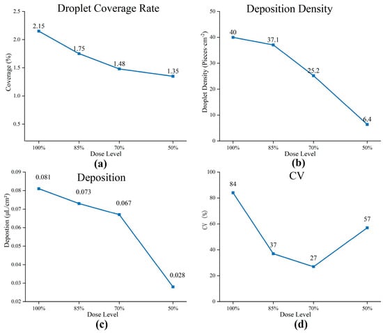 Quantitative evaluation of spray application efficacy across different application rates. (a) Droplet coverage (%), (b) Deposition density (droplets/cm2), (c) Deposition volume (μL/cm2), and (d) Coefficient of variation (CV, %). The results show a clear trend of decreasing deposition metrics with reduced application rate. The 70% rate achieved the most uniform deposition (lowest CV). In comparison, the extreme rates (50% and 100%) showed greater variability, suggesting potential challenges with the spray system’s dynamic response at non-standard flow rates.
