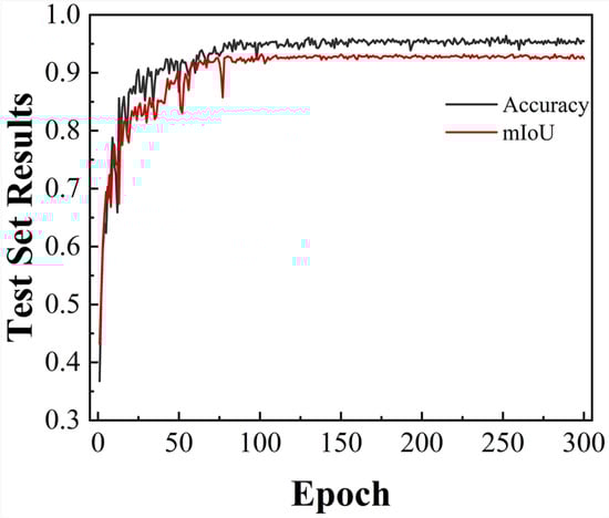 As shown in Figure 4, the model accuracy improved rapidly during the initial 50 epochs, indicating effective parameter optimization in the early training phase. As training advanced, model performance progressively stabilized, reaching convergence at approximately epoch 150. At the final convergence, the classification accuracy and mean intersection over union (mIoU) reached 95.82% and 92.52%, respectively.