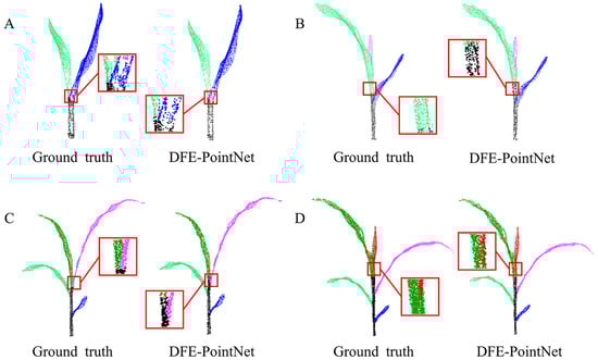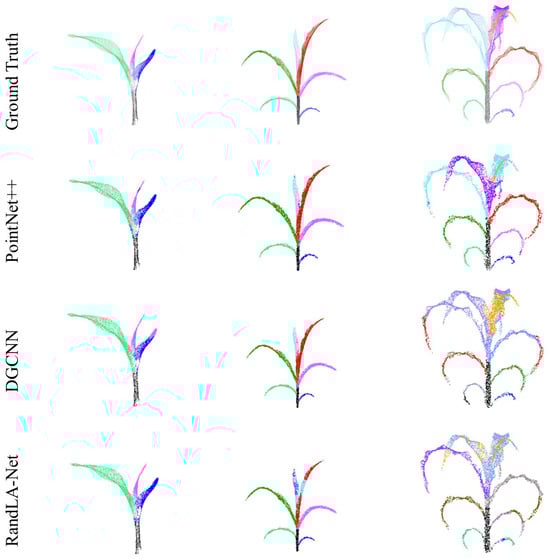 Overall, these models produced satisfactory segmentation results under conditions of relatively simple plant morphology and a limited number of leaves. However, as the complexity of the canopy structure increased with the number of leaves, and occlusions became more severe, only DUFA-Net was able to consistently achieve accurate identification and segmentation of individual leaves. Although PointNet++ and DGCNN maintained favorable performance in scenarios with a small number of leaves, owing to their respective advantages in hierarchical local feature learning and KNN-based feature space aggregation, their segmentation accuracy declined significantly in high-density cases. Specifically, due to the uneven point density and increased leaf occlusion in complex maize architectures, both models exhibited substantial misclassification, particularly at leaf edges and in overlapping regions.