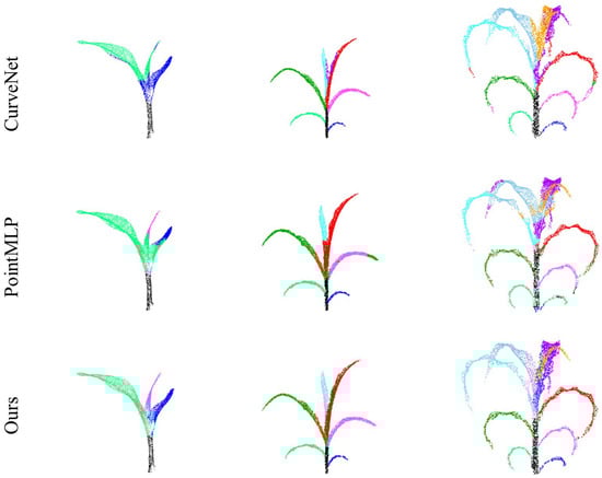 Figure 7 displays the instance segmentation outcomes of DUFA-Net applied to the Syau Single Maize dataset, in comparison with five representative point cloud segmentation methods, including PointNet++, DGCNN [], RandLA-Net [], CurveNet [], and PointMLP []. For samples with fewer leaves (e.g., three leaves), all methods exhibited relatively reliable performance, with the exception of PointMLP, which showed a higher incidence of segmentation errors. However, as the number of maize leaves increased (e.g., six leaves), RandLA-Net exhibited noticeable confusion in distinguishing between the fifth and sixth leaves. Moreover, with the exception of DUFA-Net, which consistently maintained high segmentation accuracy, the remaining methods began to produce segmentation errors, particularly along leaf boundaries and in regions with initial overlap.