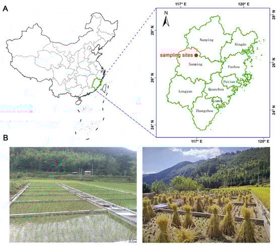 The sampling sites in Jiangle County, Sanming City, Fujian Province, China (A). Growth and harvest of rice during the trial period (B).