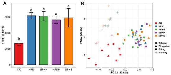 Rice yields and soil physicochemical properties. Rice yields under different fertilization treatments (A). Different lowercase letters above bars indicate significant differences among fertilization treatments (one-way ANOVA, Bonferroni test). PCA plots of soil properties among rice growth stages and among fertilization treatments (B).