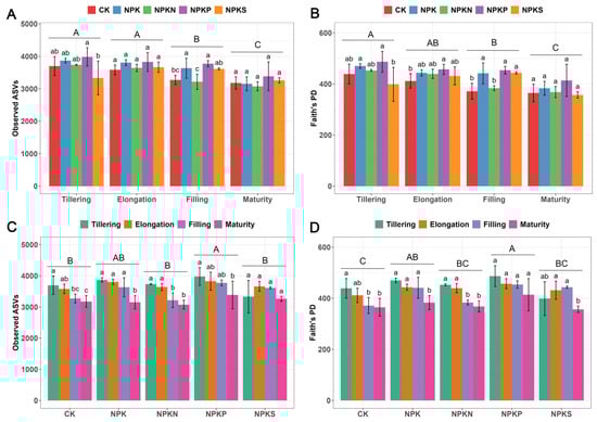Observed ASVs among different growth stages (A) and fertilization treatments (C). Faith’s PD among different growth stages (B) and fertilization treatments (D). Different uppercase letters and different lowercase letters above bars indicate significant differences.