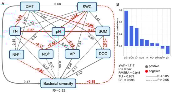 Structural equation model (SEM) used to assess multivariate effects on the soil bacterial diversity (A). Solid and dash lines indicate the significant and non-significant pathways, and gray and red lines indicate the positive and negative correlations, respectively. The numbers are the standardized path coefficient. Standardized total effects of environment factors on soil bacterial diversity as revealed from the SEM (B).