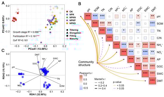 Soil bacterial community structure and its influencing factors. The PCoA ordinations show soil bacterial communities among rice growth stages and fertilization treatments (A). Mantel test of soil bacterial community structure based on Bray–Curtis distances (B). Redundancy analysis (RDA) of soil bacterial community structure for all samples (C). Asterisks represent significance of correlation (*, p < 0.05; **, p < 0.01; ***, p < 0.001).