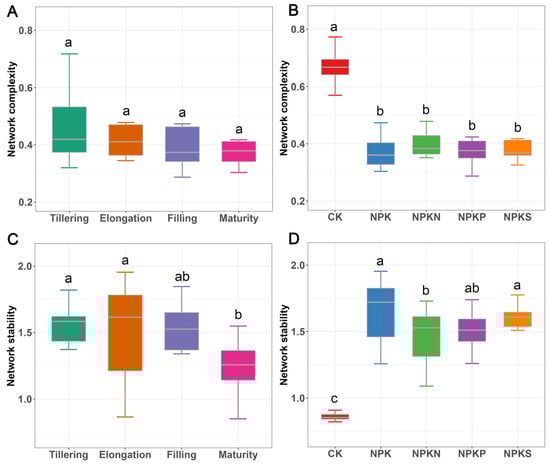 Soil bacterial network complexity among different growth stages (A) and fertilization treatments (B). The stability among different growth stages (C) and fertilization treatments (D). The differences in the complexity and stability are identified by the Bonferroni test. Different lowercase letters above boxes indicate significant differences.