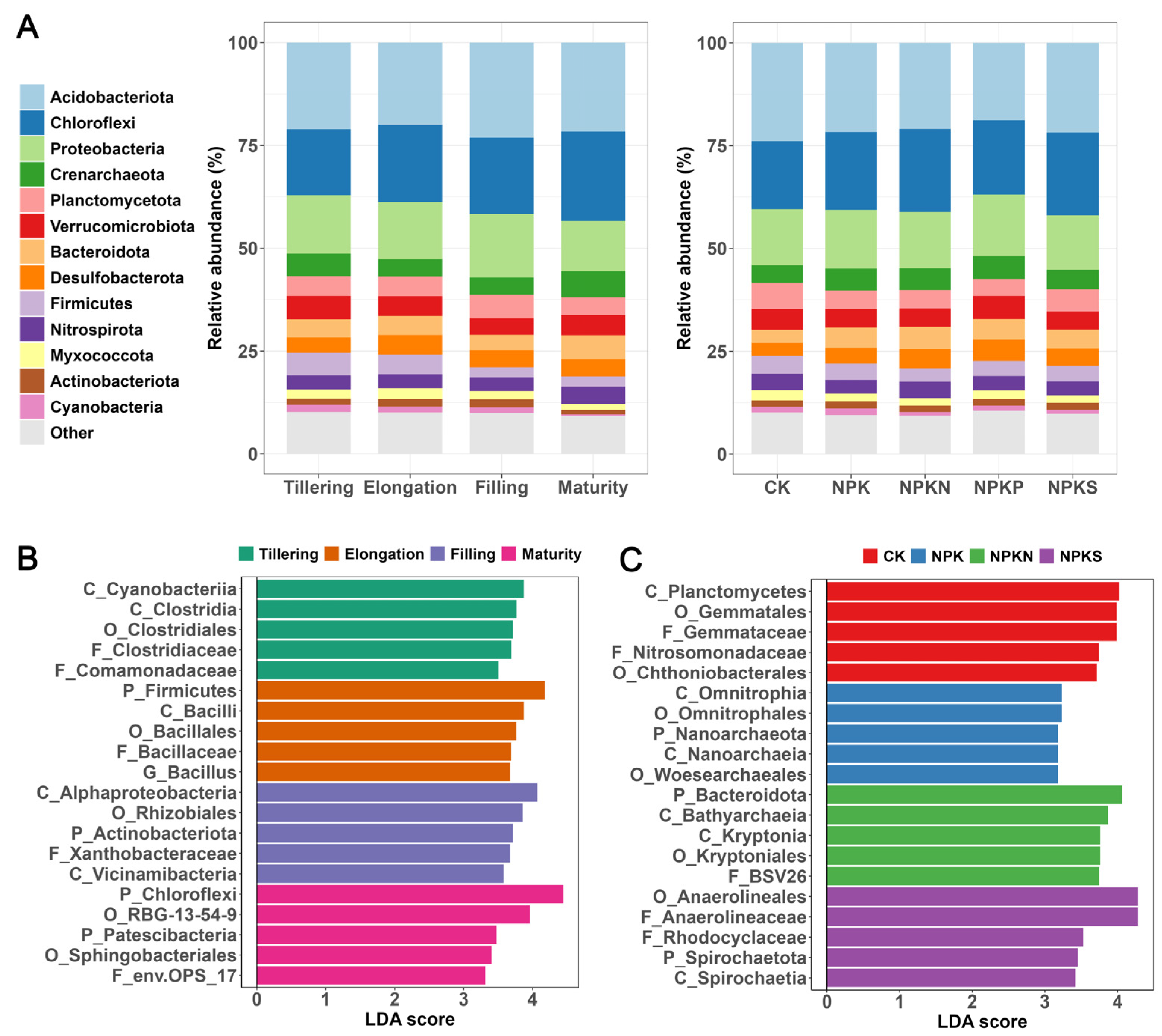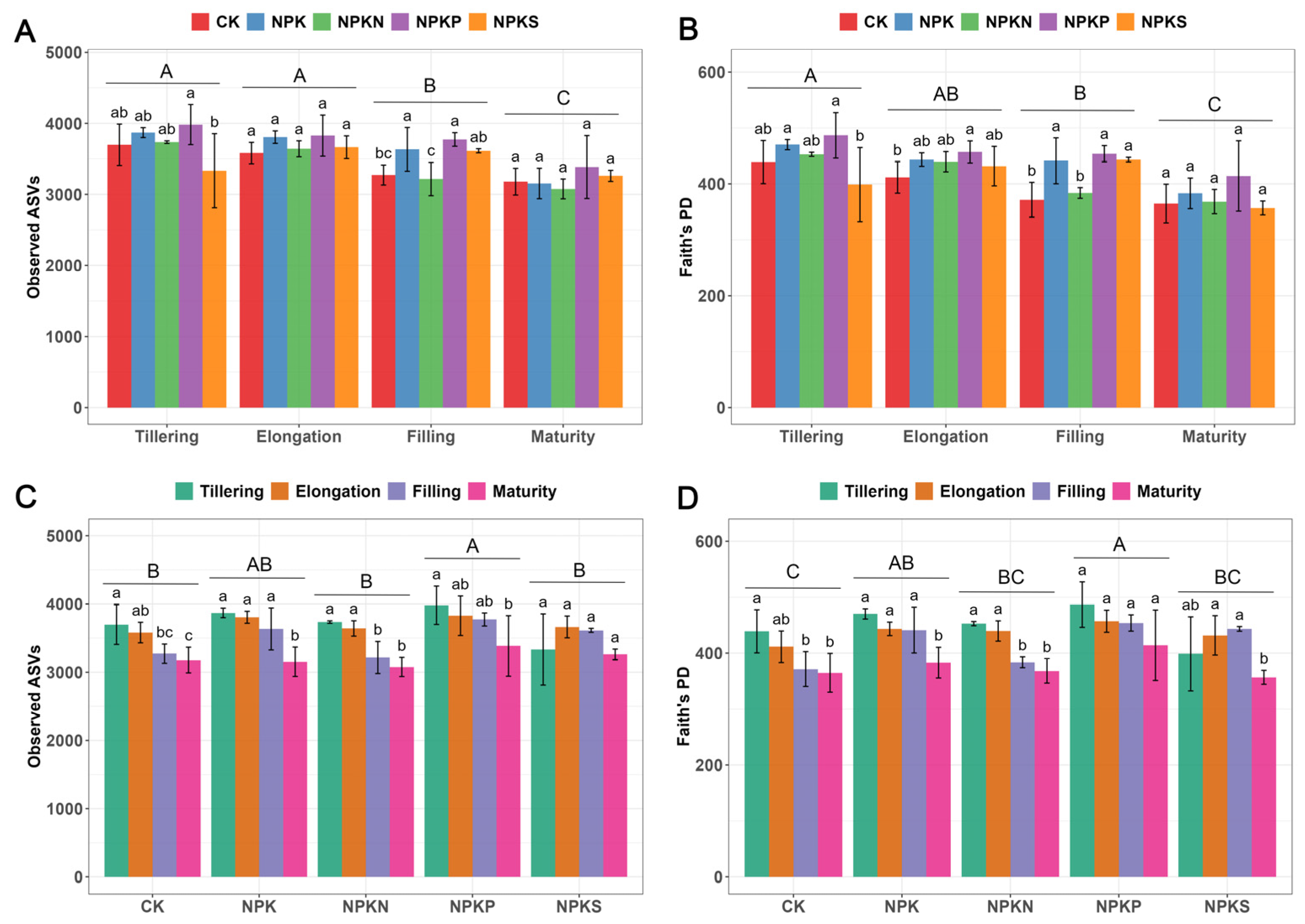 4.1. Rice Growth Stages Outweigh Fertilization for Soil Bacterial Diversity