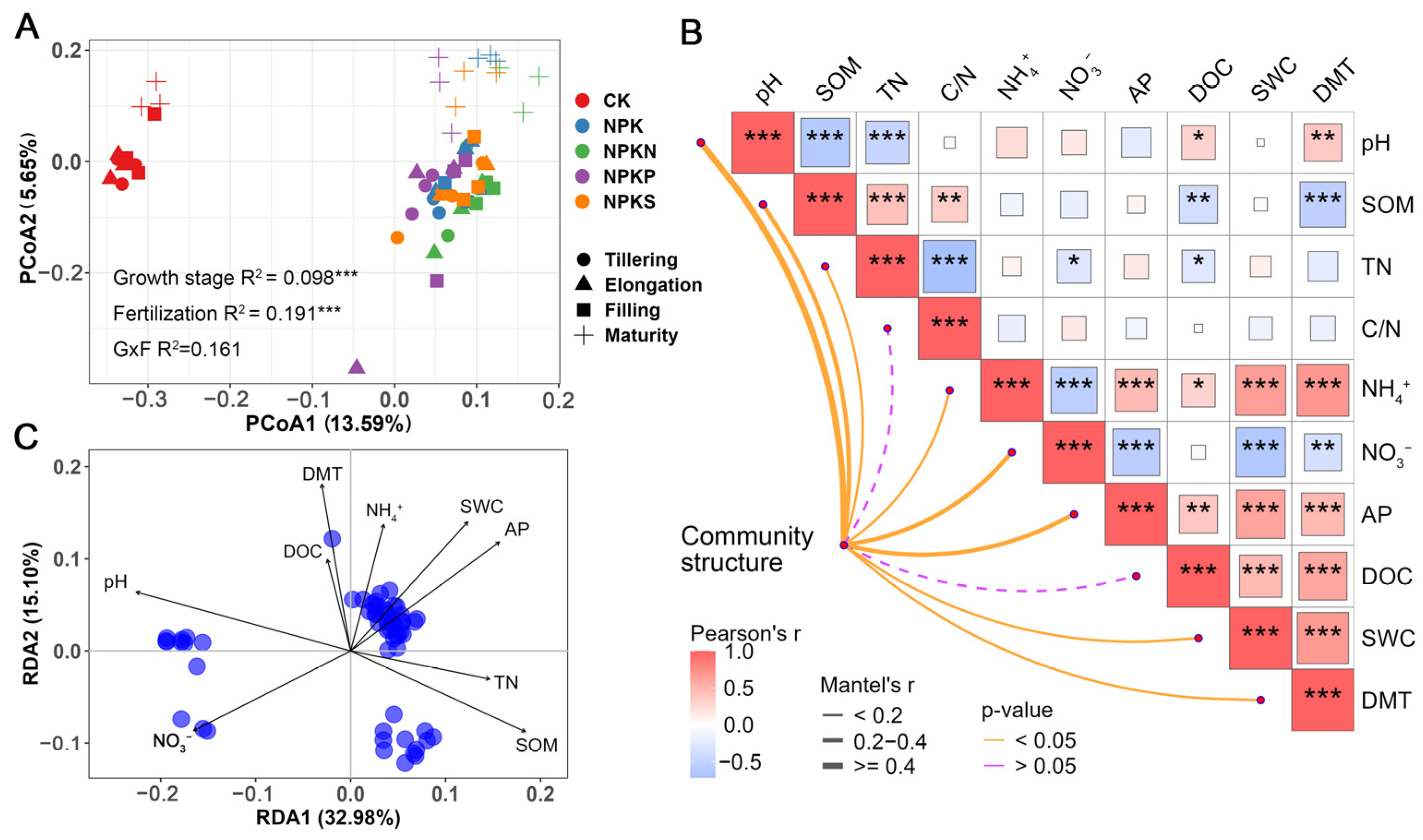 - Yan, Y.; Zhou, X.; Liu, L.; Cai, Z.; Penuelas, J.; Huang, X. Soil Nutrient Enrichment Induces Trade-Offs in Bacterial Life-History Strategies Promoting Plant Productivity. Adv. Sci. 2025, e10066. [Google Scholar] [CrossRef]