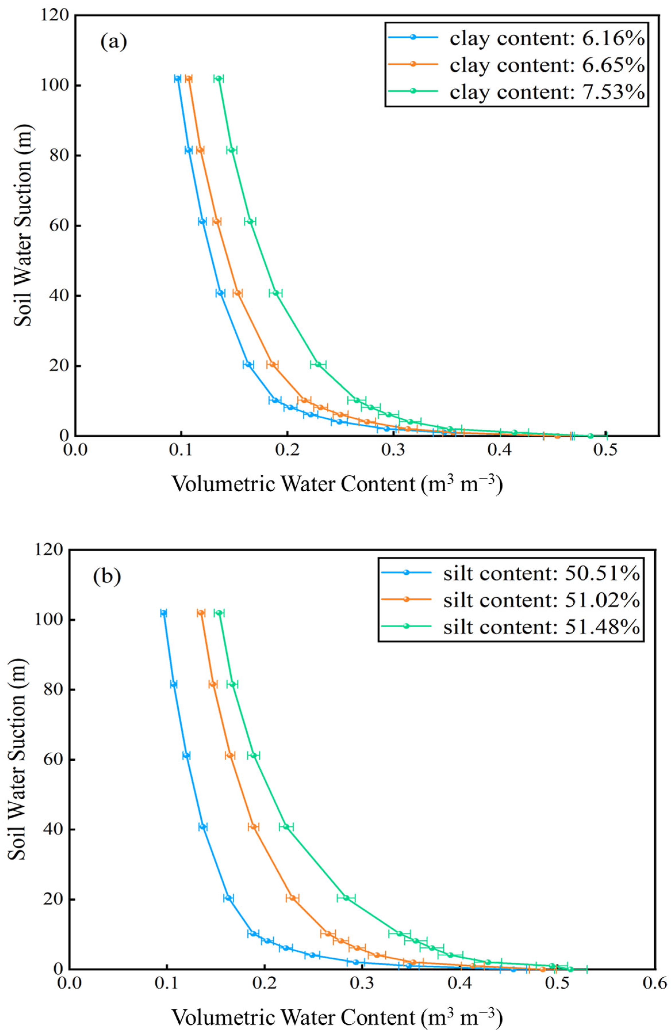 The parameter α in the VG model governs the soil pore-size distribution, primarily influencing the horizontal position of the SWCC. The parameter n characterizes the pore-size distribution uniformity, which dictates the steepness of the curve’s inflection point. The saturated water content [
