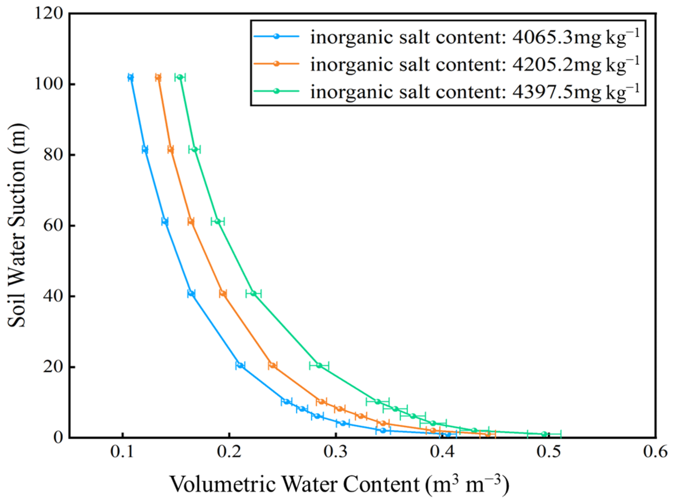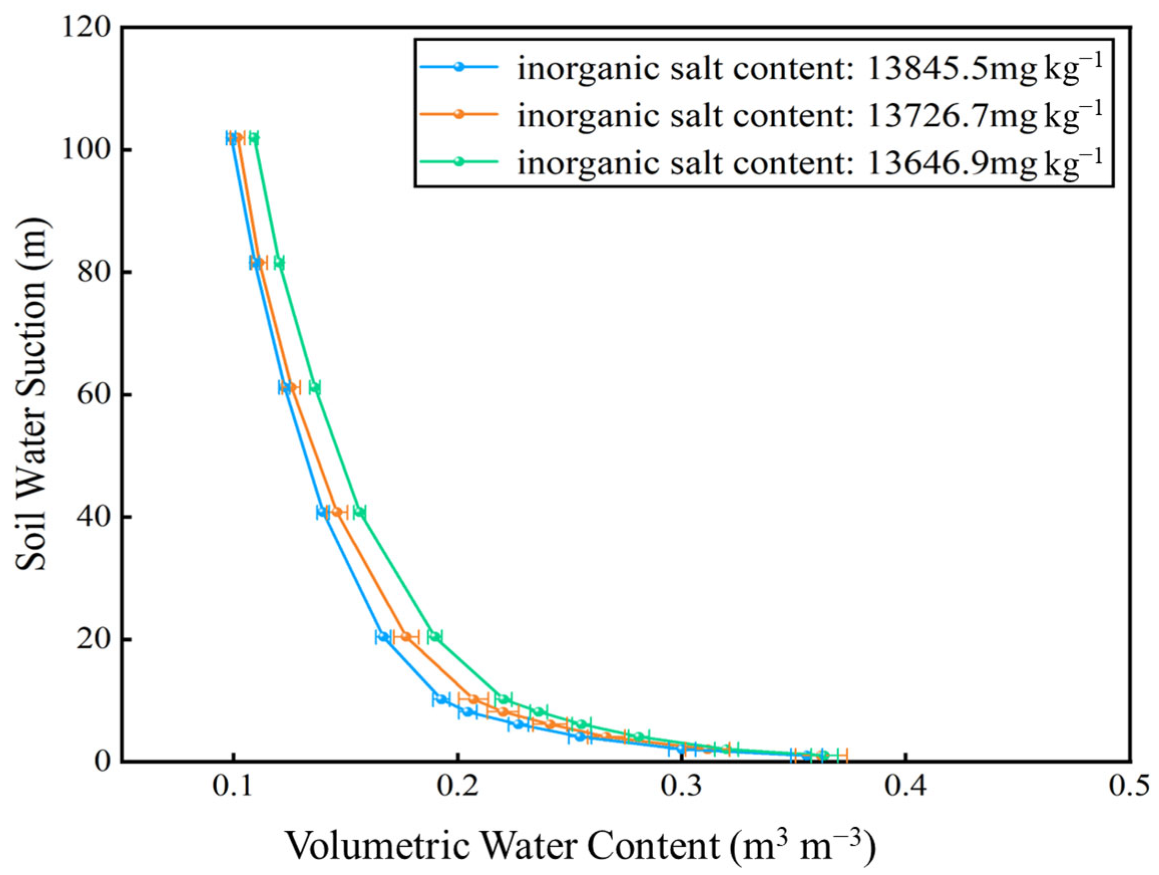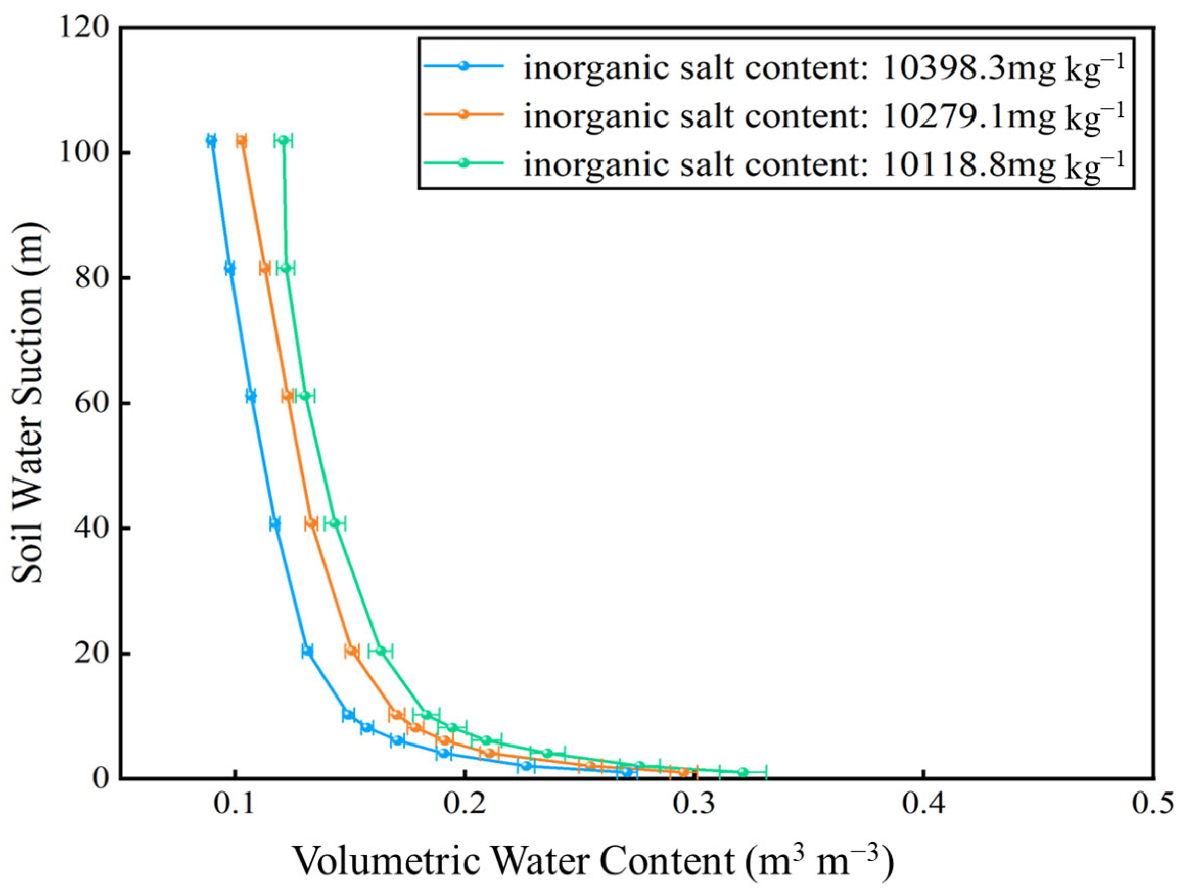 Figure 11. The results indicate that the volumetric water content of all soil samples decreased as soil suction increased. Treatment with saline solutions enhanced the soil water retention capacity to some extent during specific stages. However, the water retention capacity did not increase monotonically with rising salinity levels; instead, it initially increased and then decreased, a trend particularly pronounced under high suction conditions. This phenomenon can be attributed to the following mechanisms: compared to pure water, low-salinity solutions contain a considerable number of ions. Since soil particle surfaces are charged, they can adsorb a significant amount of ions from the solution—typically up to three layers. This adsorption process increases the specific surface area of the soil particles, thereby facilitating the retention of more water molecules. Furthermore, during the desorption process, a portion of the salts originally dissolved in the soil solution precipitates and forms crystals. This precipitation alters the soil microstructure, increases the proportion of small pores, and consequently enhances the water-holding capacity of the soil [