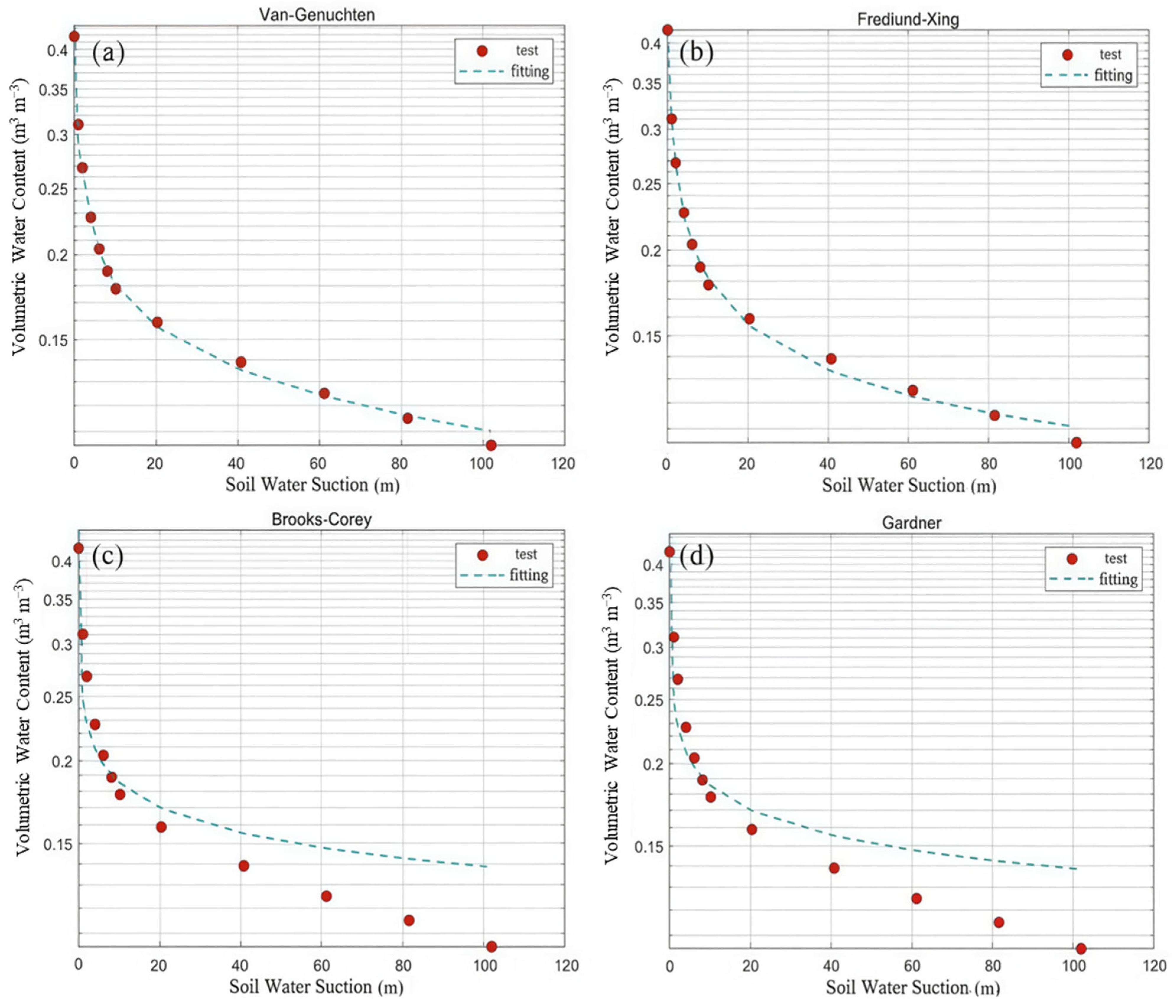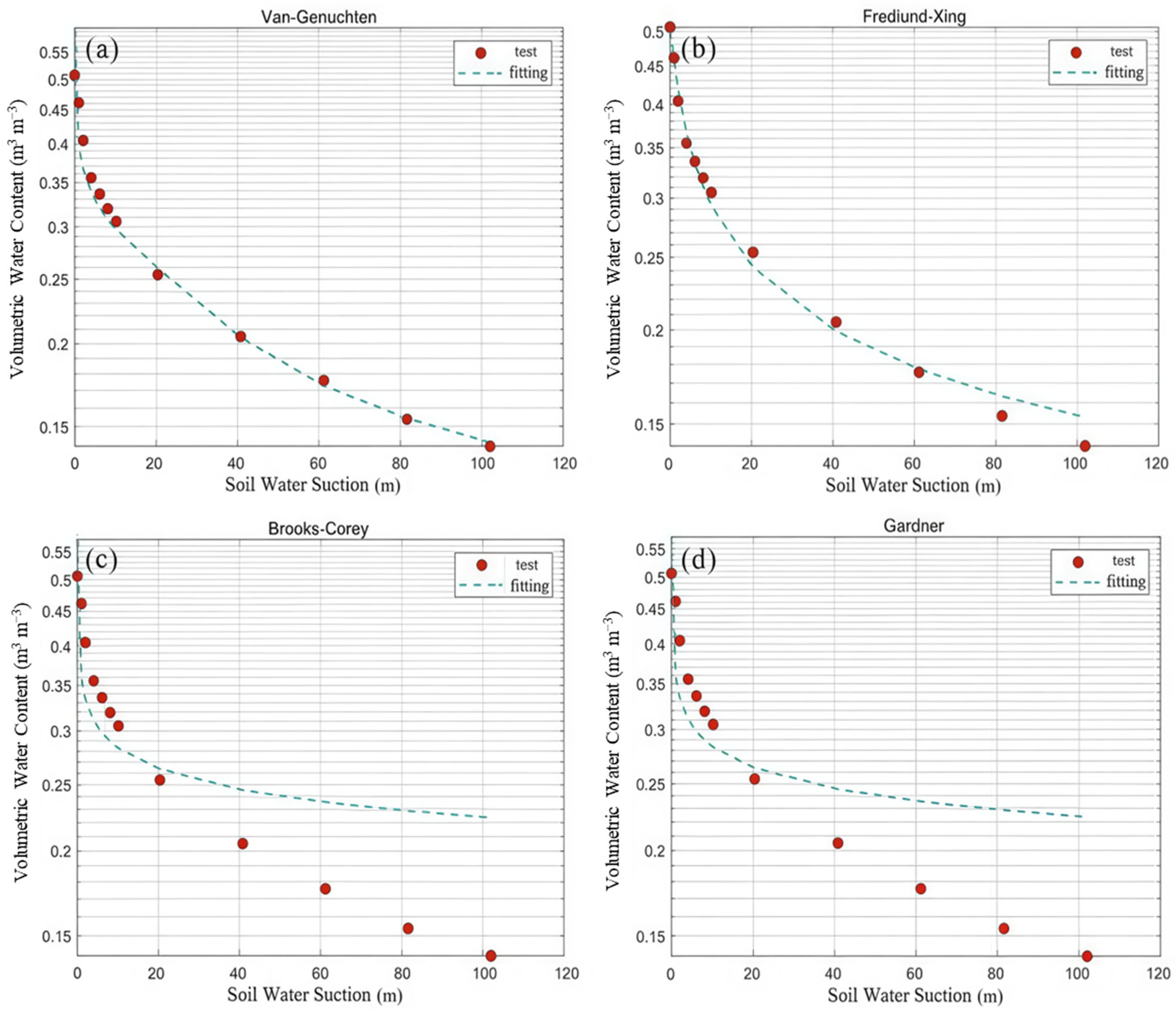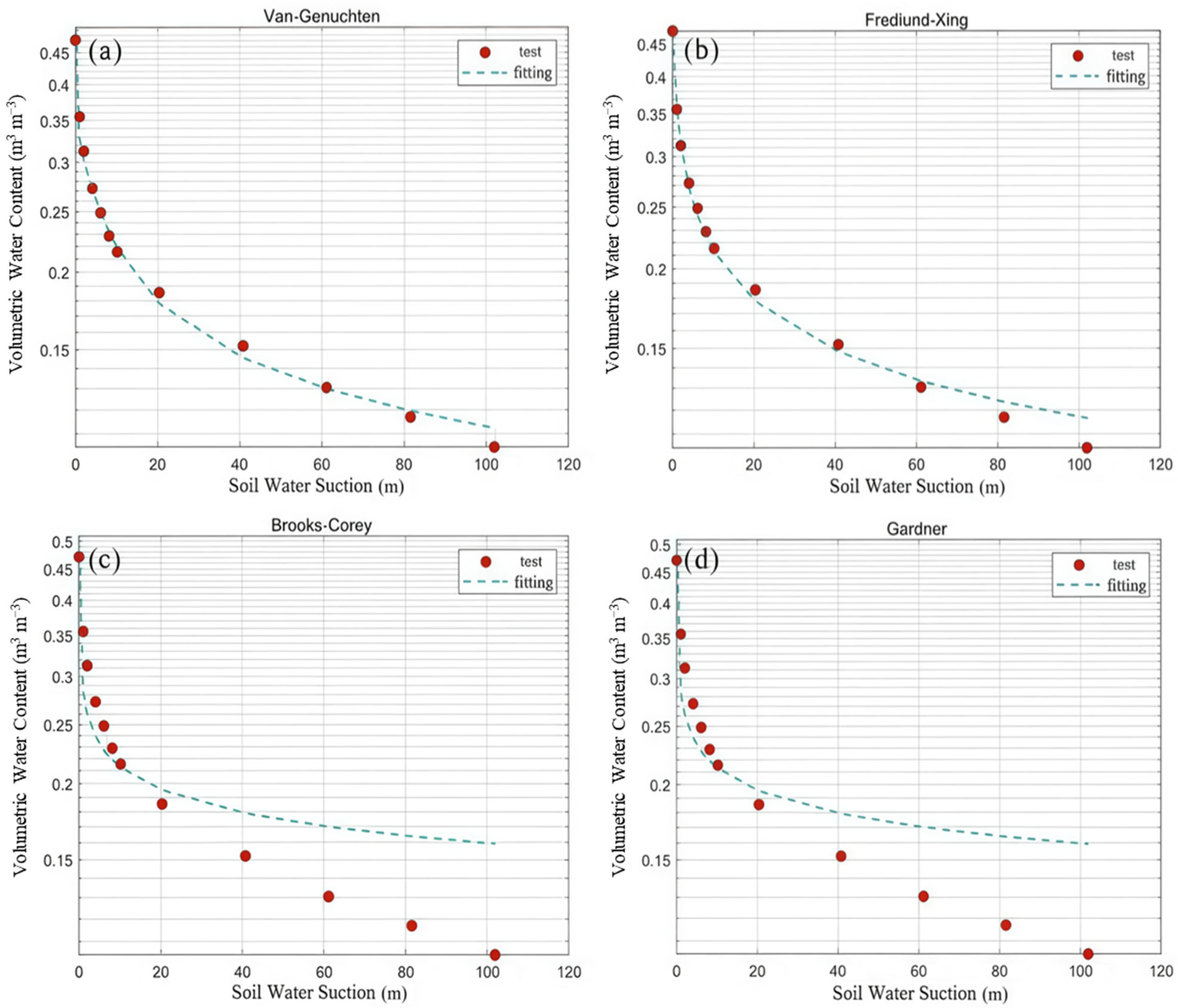 Table 8. A comparative analysis of these parameters elucidates the divergence in model performance during the fitting procedure and their respective capacities to characterize the SWCC. This assessment provides critical insights for subsequent model selection.