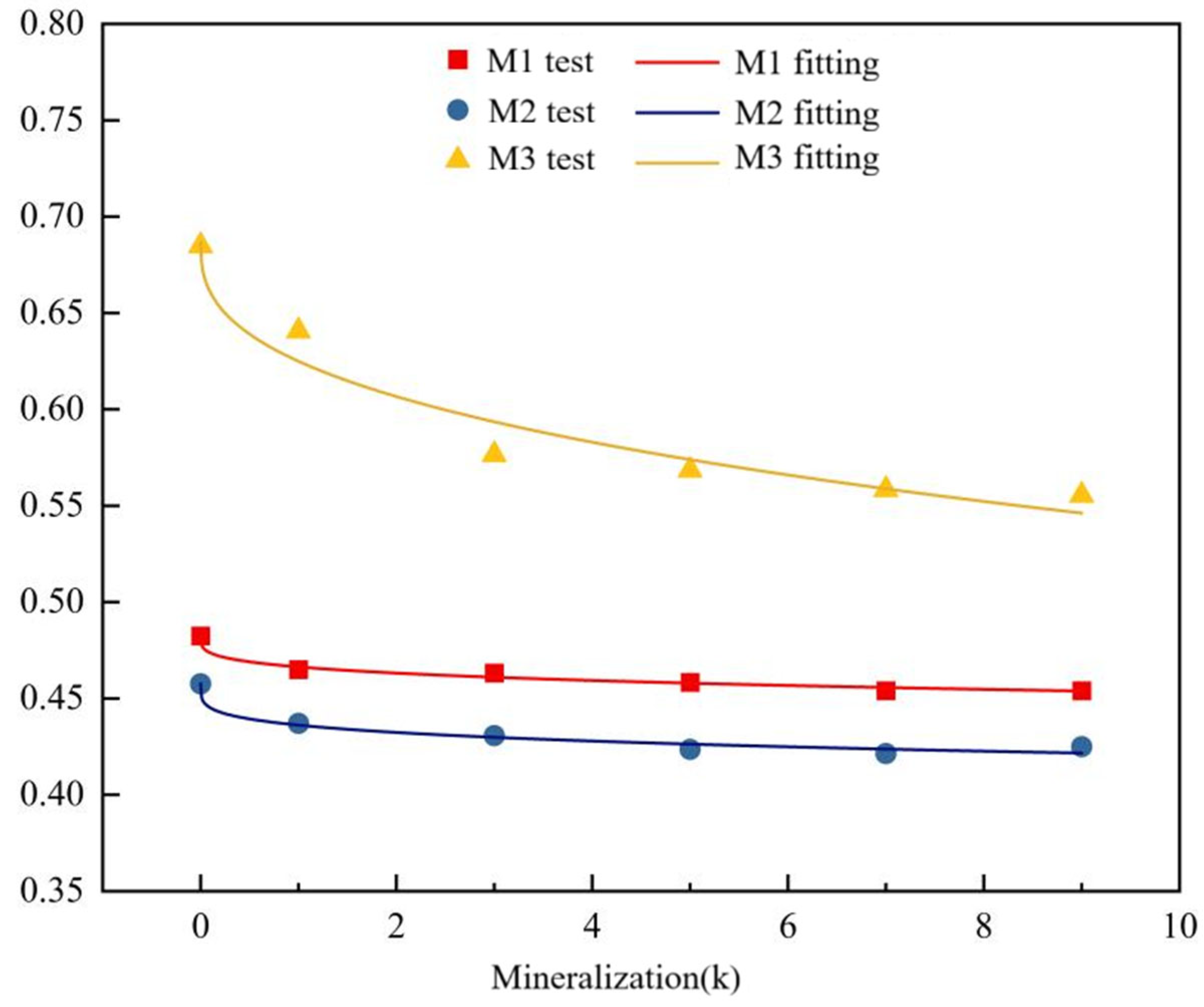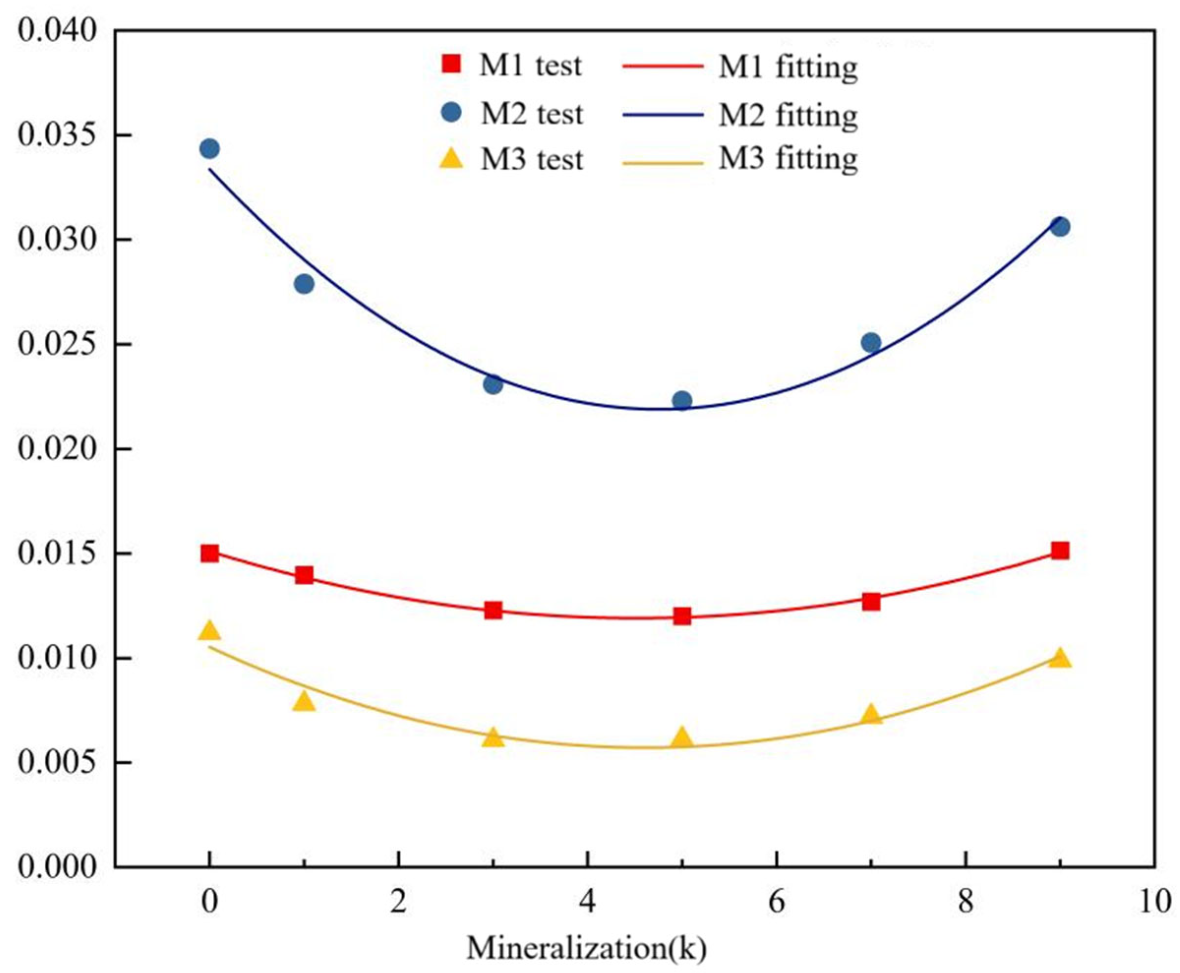 Figure 14, the saturated water content θs decreases progressively with rising mineralization, demonstrating a reduction in water retention under high salinity conditions. This inverse correlation is effectively modeled by a power function. The slope of the θs-mineralization curve is significantly steeper for M3 than for M1 and M2, and the overall θs values adhere to the ranking M3 > M1 > M2. The more retentive pore structure of M3 allows it to maintain a higher θs even at elevated mineralization levels. The diminishing effect of further increases in mineralization on θs underscores the importance of the soil’s innate salinity level in modulating its response.