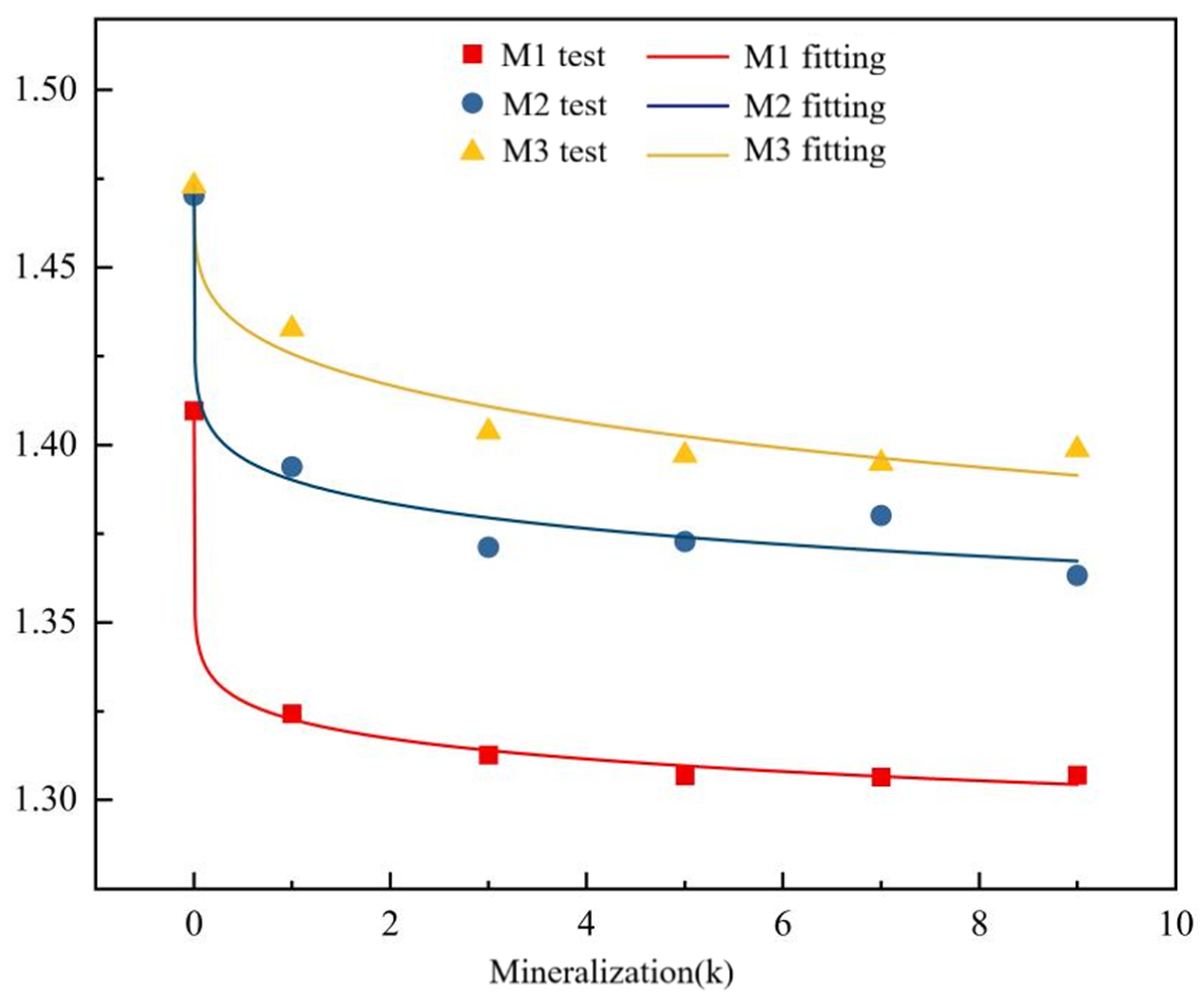 Figure 13 reveals a gradual decline in the parameter n with increasing mineralization, a trend well captured by a power function [