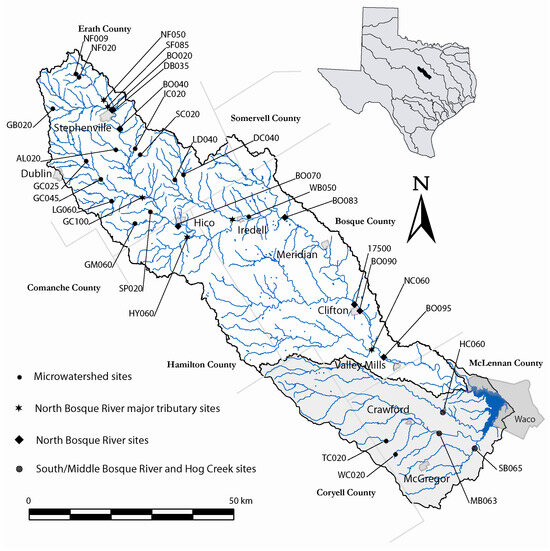 To support the multidisciplinary assessments, in-stream and edge-of-field monitoring stations were established throughout the Bosque River watershed (BRW) (Figure 1) to provide monitoring data for biophysical model calibration and validation efforts. The upper portion of the BRW is the drainage area for a major portion of the dairy manure application fields in north central Texas. Economic assessments indicated that composting of dairy manure for end uses outside the watershed would provide the most environmentally beneficial results but would also entail substantial cost implications to the dairy producers [31]. Manure application at total crop agronomic phosphorus rates, particularly with incorporation, where practical, would yield substantial but smaller water quality benefits, and entail much less cost than composting. Economic and environmental impacts were also determined for manure application at total crop agronomic nitrogen rates, plant-available agronomic crop nitrogen, and phosphorus rates, as well as manure solids separation management [6,31].