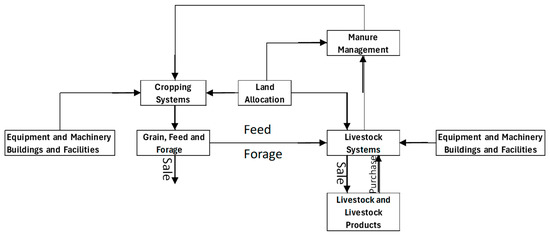 Several FORTRAN routines within FEM estimate the costs and returns of a farm based on livestock and crop operation schedules; ownership and the characteristics of structures, facilities, and equipment; financing terms; land areas and uses; livestock nutrition; manure production and handling; as well as other pertinent aspects of each farm enterprise. Optimizations required within the model are handled within a General Algebraic Modeling System (GAMS, Version 21.2) [44] submodule that is linked to special model routines for transfer of relevant decision and exogenous variables. The following discussion includes components of the model that are directly related to the evaluation of the manure management practices presented in this paper. A brief schematic of FEM is provided in Figure 2.