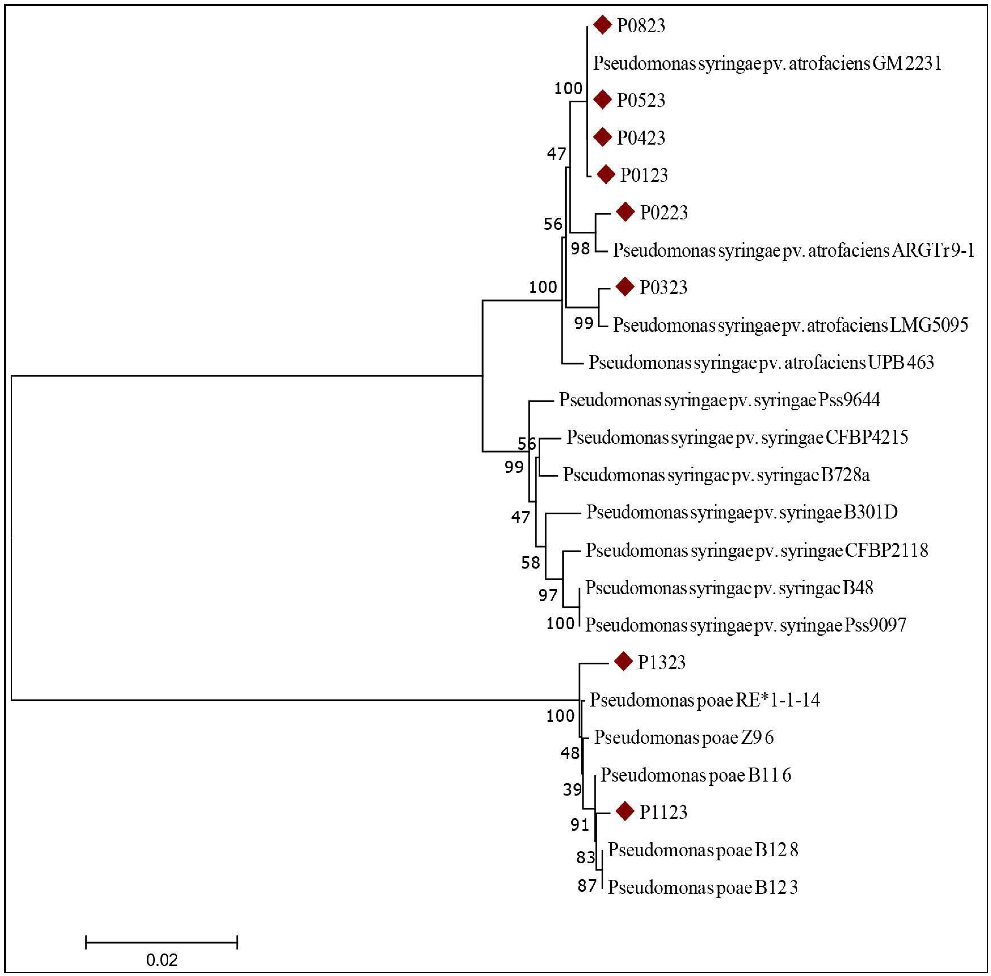 | P0223 | P. syringae pv. atrofaciens LMG5095/ P. syringae pv. syringae IO 110 (99.54%) | P. syringae pv. atrofaciens GM 2231/ P. syringae CC457, CC440, Ps02KZ, GAB0016 (100%) | P. syrinage GAB0016 (100%) | P. syringae pv. syringae EC100, EC24, EC229, LMG 5496, EC2, EC101, EC20 (99.81%) |