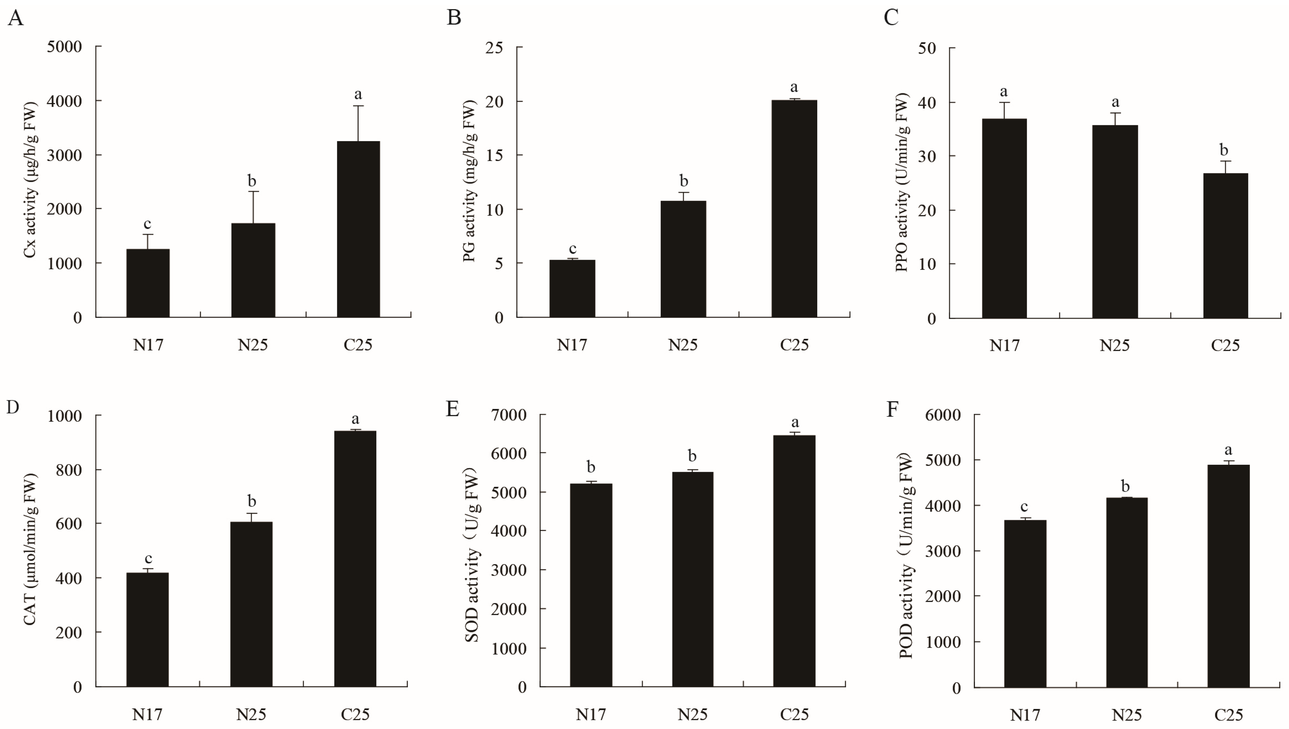 3.4. Analysis of Enzyme Activities in Fruit Peels