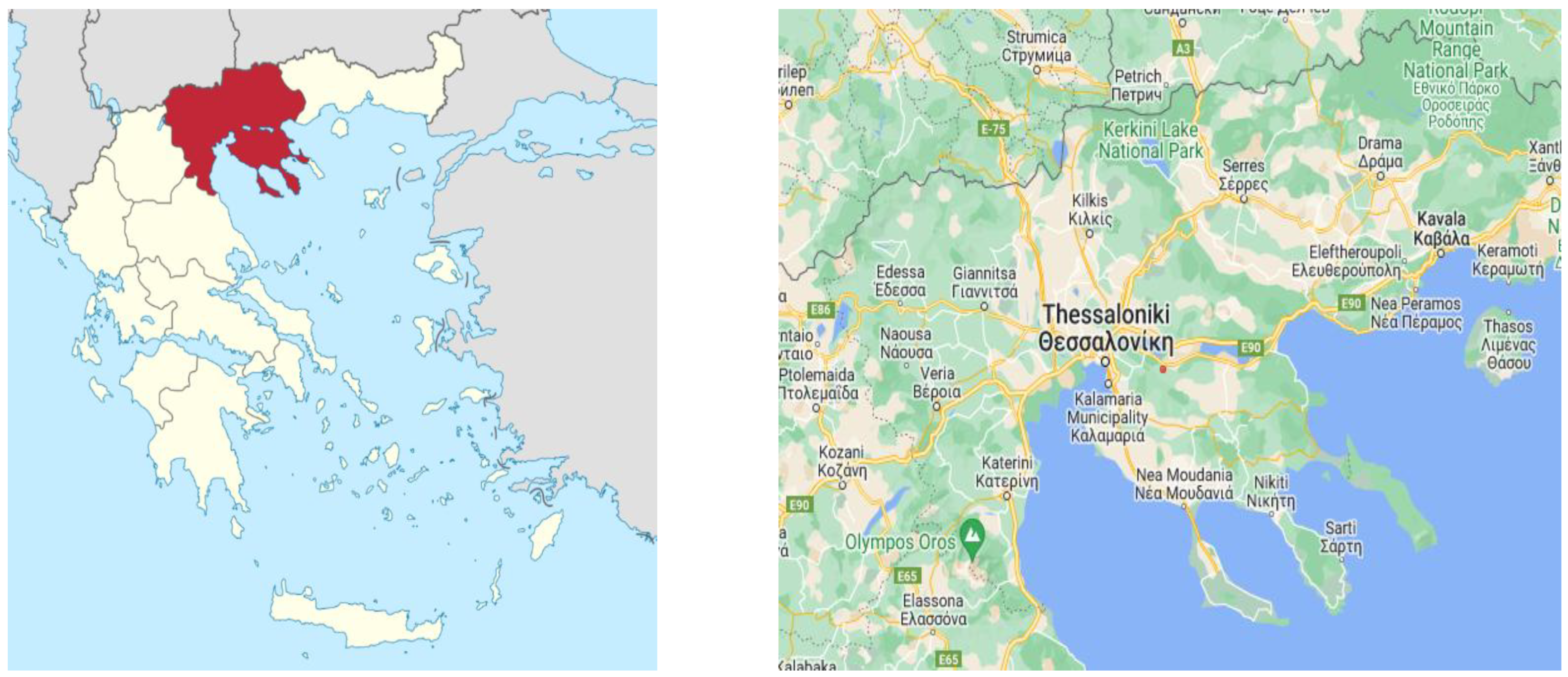 The Region of Central Macedonia is the largest in area (19,162 km2) and the second most populous region in Greece. It has well-developed industries, including the food, chemical, and mechanical equipment sectors, and is one of the country’s strongest economic regions. It also has the second-largest number of households (735,829) and more households with more than two members than Attica. Additionally, it is the region with the most significant number of households actively employed in the primary sector across all Greek regions [64]. Central Macedonia is unique in that it has experienced simultaneous intense development in industry, agriculture, and tourism. It boasts the largest urban center outside of Attica and occupies a strategic position as a bridge between Greece and the Balkans. The Region of Central Macedonia is one of Greece’s most dynamic and multifaceted economic and cultural hubs. According to available data, it significantly contributes to the national GDP, ranking second after Attica. The region’s economy is diversified, with strong sectors in industry, services, and agriculture. Central Macedonia (Figure 2) represents 17% of Greece’s economically active population. The share of the economically active population among those aged 15 and over was 51% in 2015 and 49% in 2020. reflecting a slight decrease in labor force participation. Overall, Central Macedonia boasts a dynamic economy, with diverse sectors contributing to its growth and development. The sample size was chosen to ensure adequate representation of this population and sufficient statistical power for reliable analysis of household food waste behavior. The minimum sample size required for a given population was determined according to the following formula [65]: