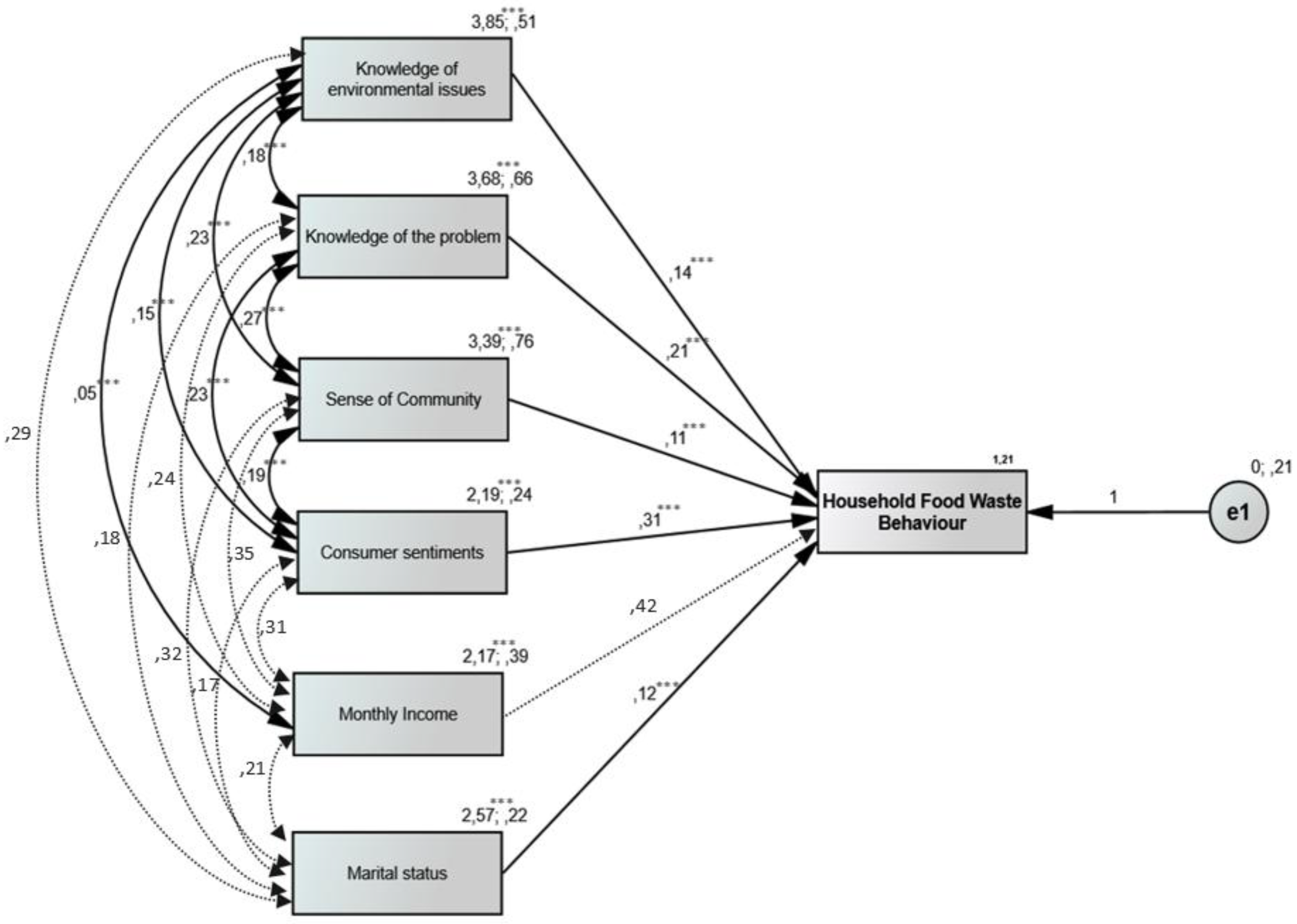 These results indicate that consumer sentiment, problem knowledge, and environmental knowledge are the strongest predictors of household food waste behavior.