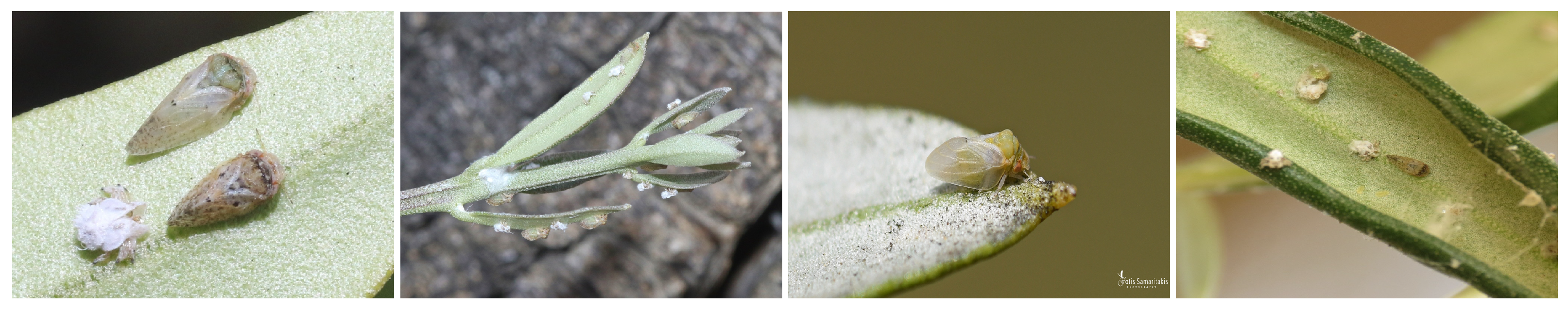 - Torres, M.J.R. Guía de manejo integrado del algodoncillo,“ Euphyllura olivina”. Phytoma España Rev. Prof. Sanid. Veg. 2022, 343, 64–66. [Google Scholar]