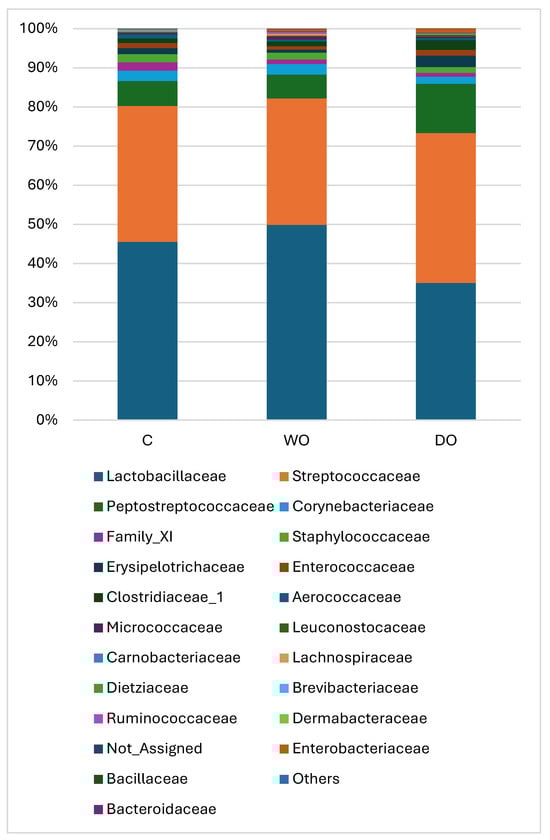 Effects of dietary treatments on the relative abundances of bacterial families. C—control; WO—whole oat-based diet; DO—dehulled oat-based diet. The data were compared using one-way ANOVA, using the treatments as the main factors.