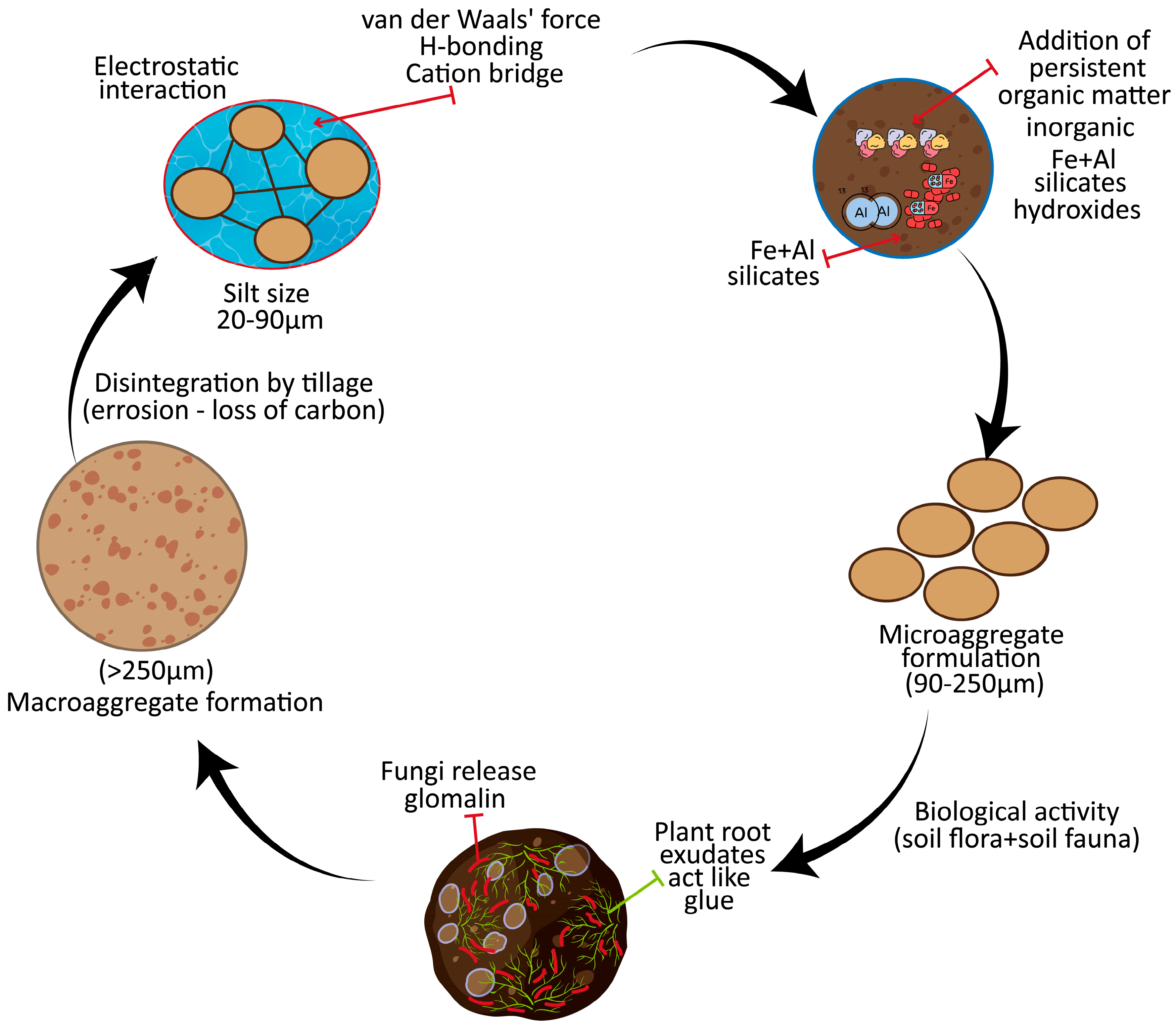 | Carbon Sequestration | The OM is physically protected by macro-aggregates while organo-mineral association protects the SOC | Reduction in greenhouse gas emission, protection of SOC for long-term | [54,55,56] |
