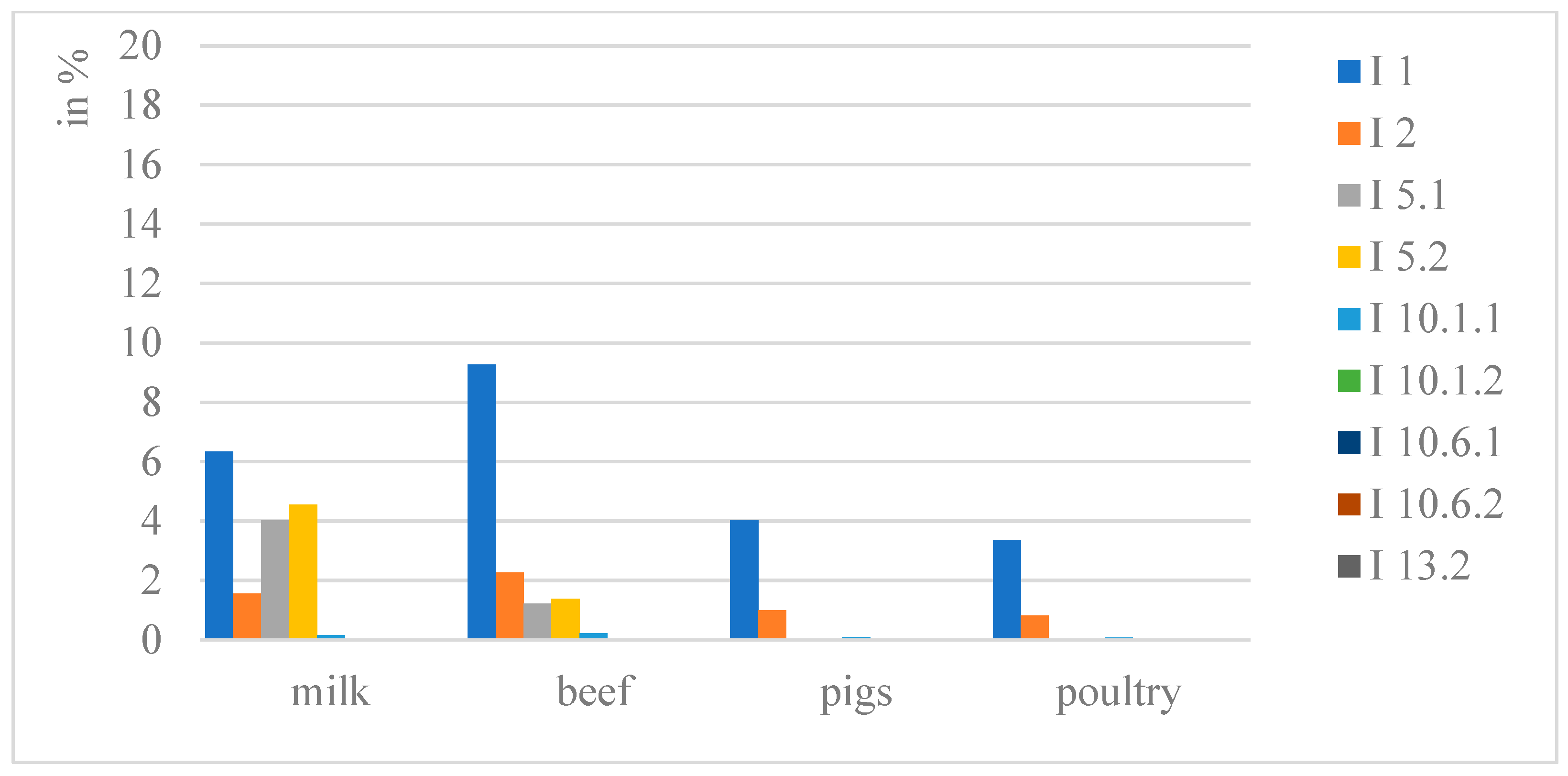 The values in Equations (6) and (7) for the budget constraint and the value of intervention actions by sector are estimates based on actual CSP data (Equations (6) and (7) were derived from Equation (1) by narrowing the scope to the analyzed number of sectors and the intervention actions considered). This is a balancing perspective and shows the scale of intervention values allocated to the agricultural markets (sectors) included in the study. One can see the dominance of Instrument I 1 (Basic income support) and the largest inflow of funds to the milk market (sector). We do not assess this, as the article takes a positive, not normative, economics perspective. This caveat also applies to subsequent inferences.