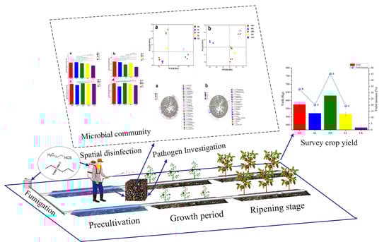 - Cheng, H.; Zhang, D.; Ren, L. Bio-activation of soil with beneficial microbes after soil fumigation reduces soil-borne pathogens and increases tomato yield. Environ. Pollut. 2021, 283, 117160. [Google Scholar] [CrossRef] [PubMed]