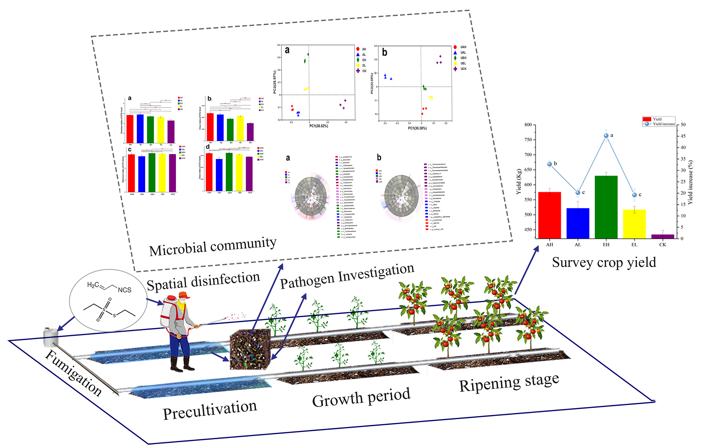 - Zhu, J.; Ren, Z.; Huang, B. Effects of fumigation with allyl isothiocyanate on soil microbial diversity and community structure of tomato. J. Agric. Food Chem. 2020, 68, 1226–1236. [Google Scholar] [CrossRef] [PubMed]