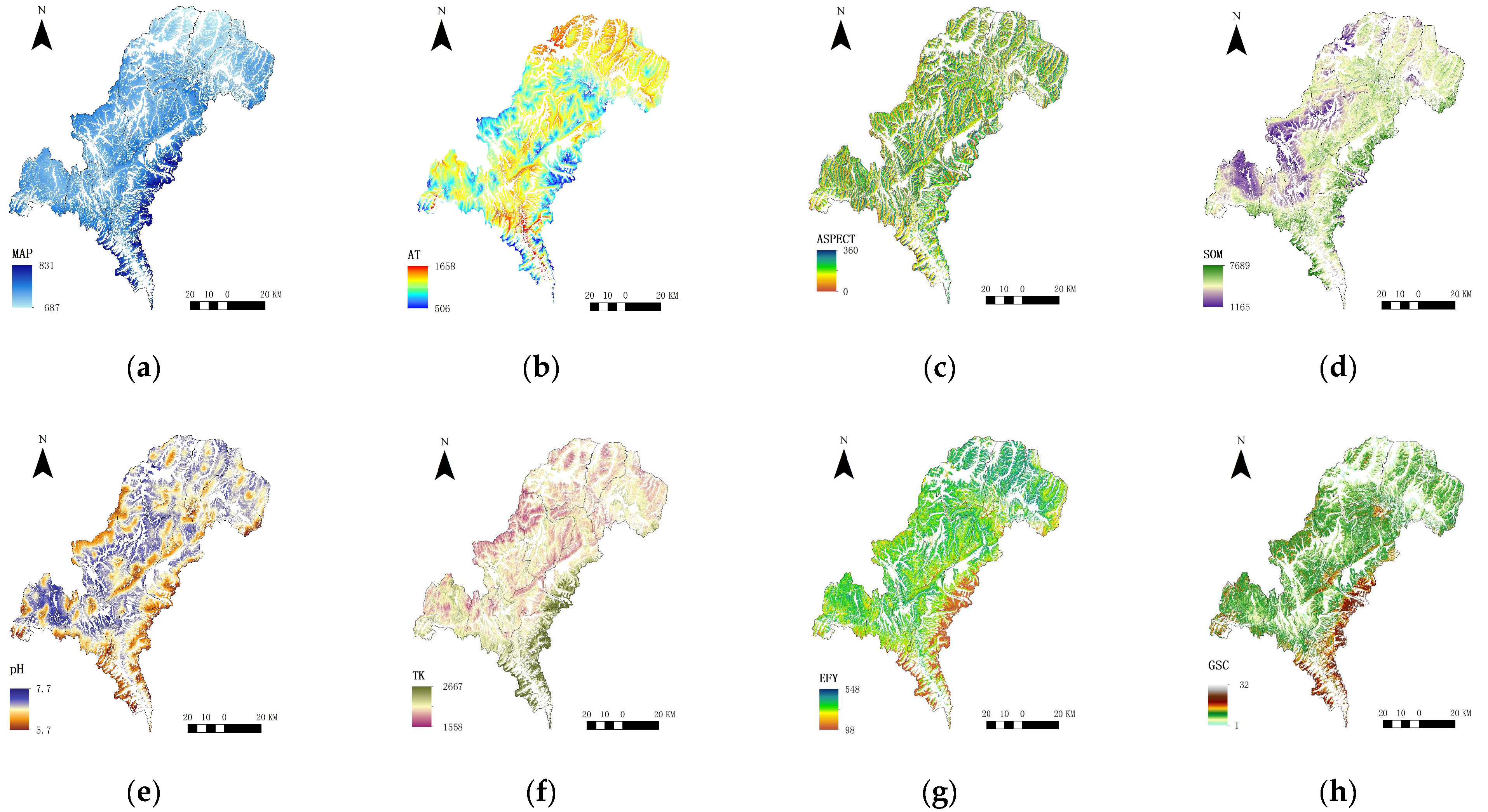 | Meteorological Data | Air Temperature | Mean annual temperature, >0 °C accumulated temperature | 2002–2022 | Station scale | http://www.geodata.cn (accessed on 1 July 2024.) | |