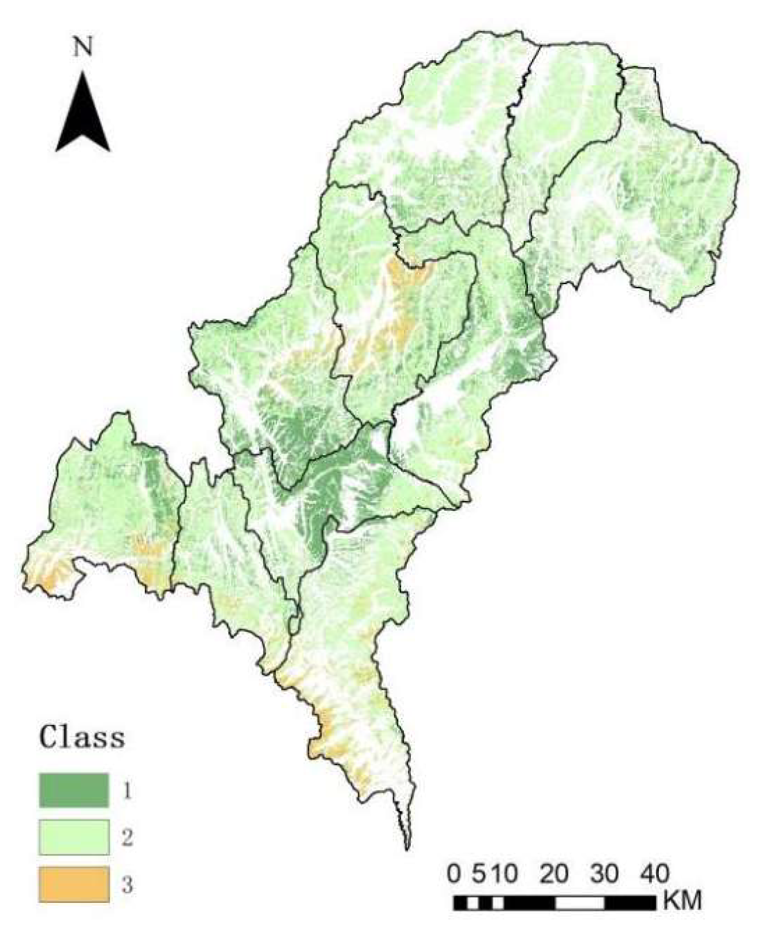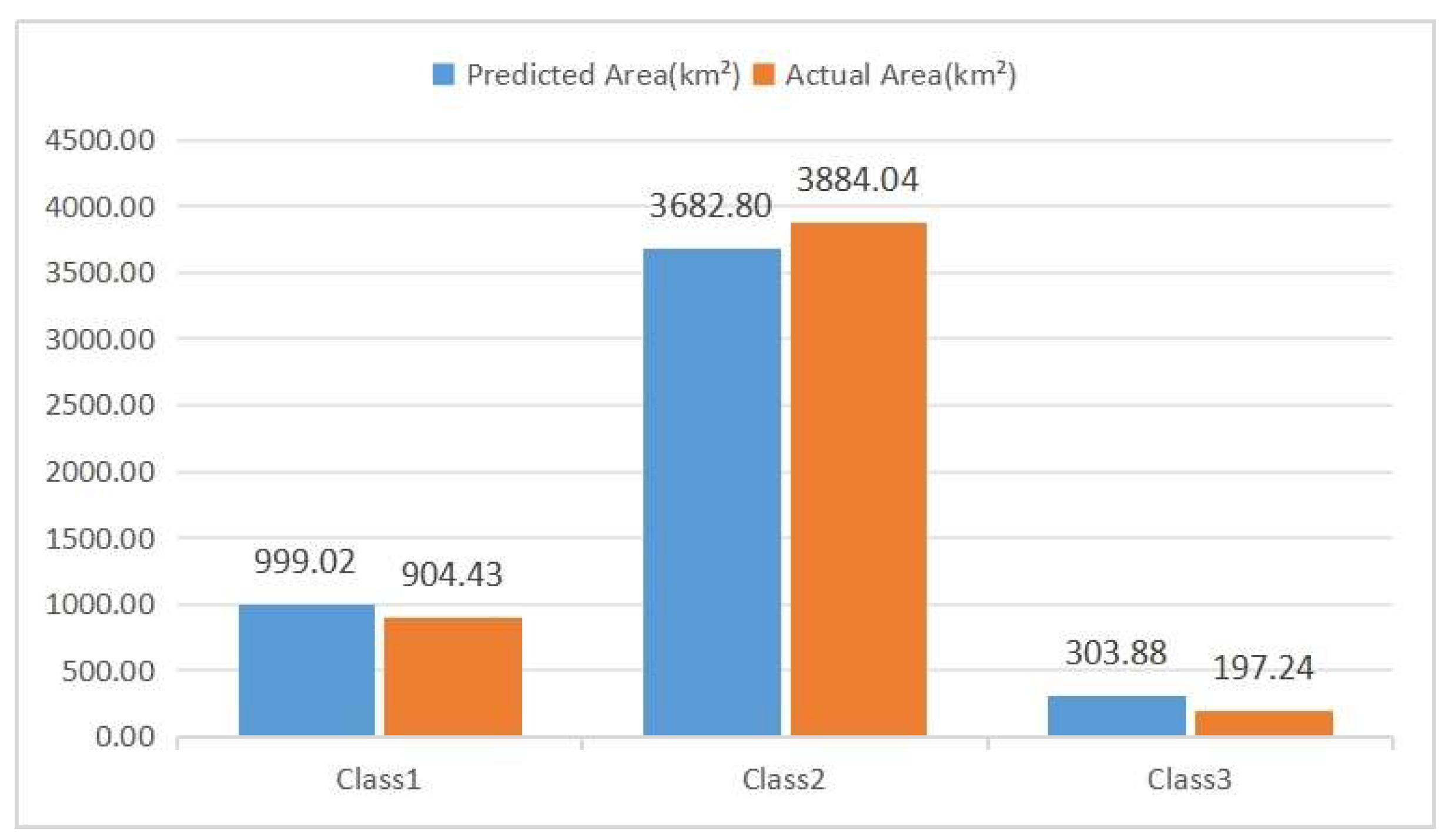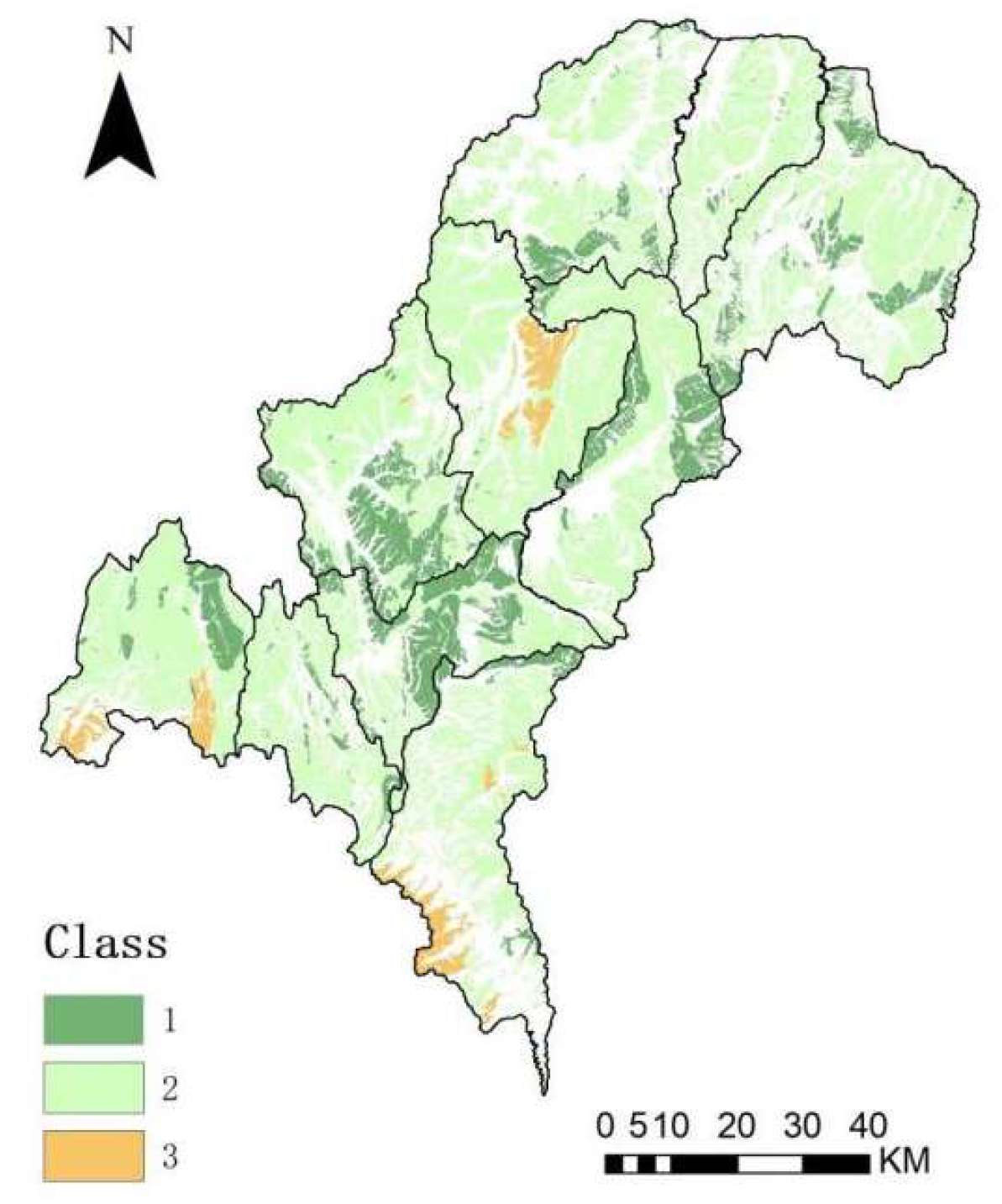 - A systematic comparison demonstrated that XGBoost achieved optimal classification performance, with an overall accuracy of 0.829. A pixel-by-pixel absolute difference analysis between the predicted and actual grassland classes revealed perfect agreement in 75.82% of the area, minor discrepancies in 23.63%, and major discrepancies in only 0.54%. Grasslands of class 2 were dominant (71.67%), while Class 1 and Class 3 grasslands were mainly distributed in river valleys with favorable hydrothermal conditions and in alpine or urban areas subject to human disturbance or harsh natural conditions, respectively.