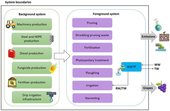 System boundaries of grape cultivation with the main activities and processes considered. RW is only considered for Scenario A, while TW is used in Scenario B. WWTP: Wastewater Treatment Plant; WW: Wastewater; TW: Treated Water; RW: Reclaimed Water.
