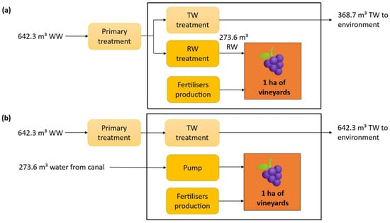 Flow diagram of the evaluated scenarios depending on whether reclaimed water (RW) or treated water (TW) is used. Although the type of fertiliser used is the same, a higher amount is required in Scenario B. WW: wastewater, (a): Scenario A, (b): Scenario B. The diagram design is adapted from Kalboussi et al. [24].