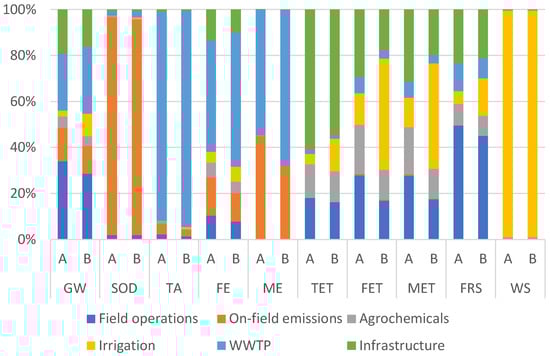 Regardless of the FU used, scenario A yields better results across all assessed categories, with the smallest differences observed in SOD and WS. In the case of WS, this is expected, as although the type and treatment of water differ in both cases, the quantity used is the same. The results for SOD are also very similar, since this category is directly related to on-field emissions, which include emissions resulting from the use of organic fertilisers and approved pesticides, as well as those associated with land use change, and are identical in both cases. On the other hand, the categories showing the most significant differences are TA, FE, ME, FET and MET. These discrepancies arise from the fact that, in Scenario B, the water undergoes only secondary treatment before being discharged into the environment, leading to a higher release of substances into aquatic systems. In contrast, in Scenario A, the use of reclaimed water enables nitrogen and phosphorus to be directly utilised as nutrient sources for the crop, thereby reducing their release into the environment.