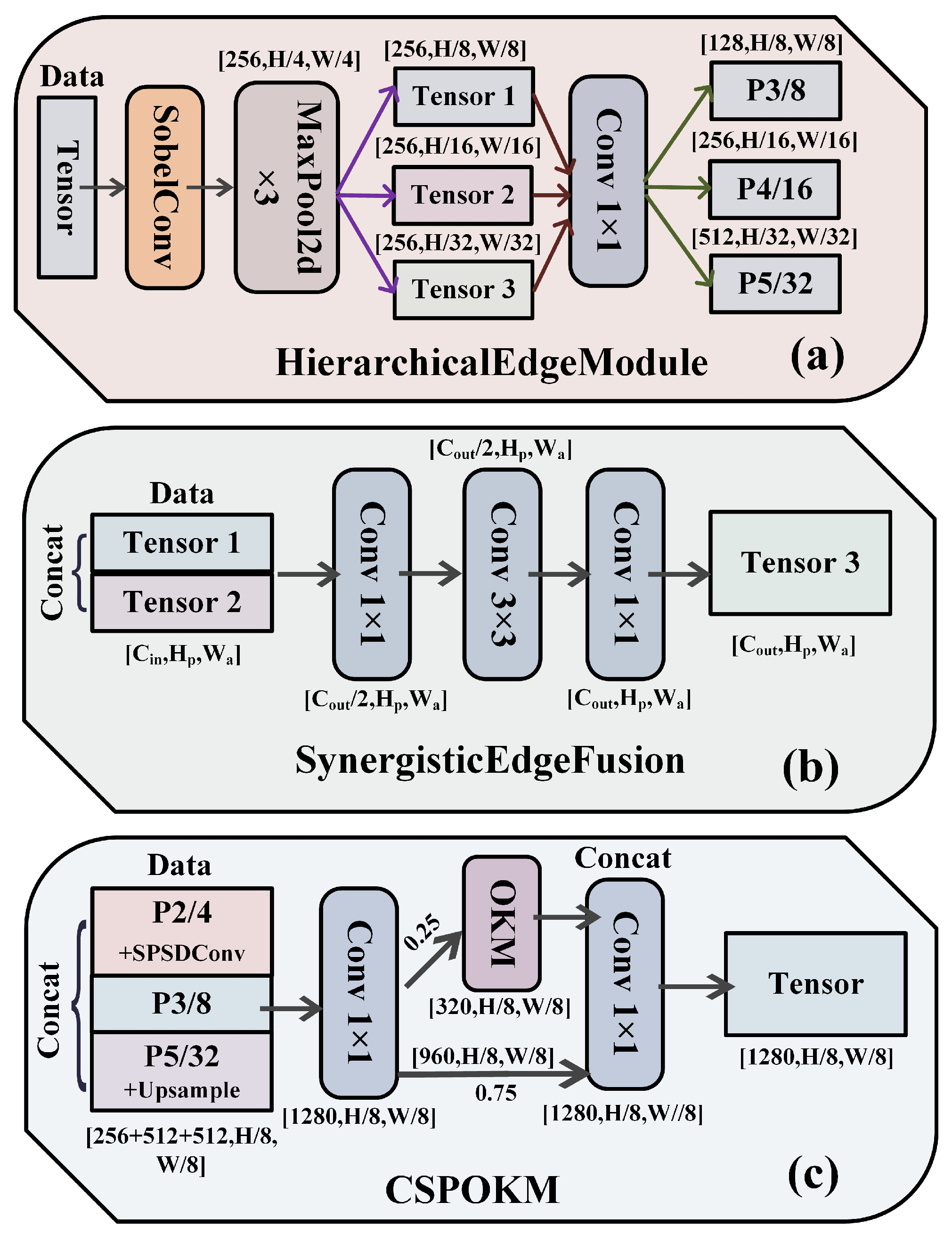 21]. These modules operate synergistically to form a network highly sensitive to edge information and endowed with robust feature representation capabilities. The architectural details of these three core modules are illustrated in