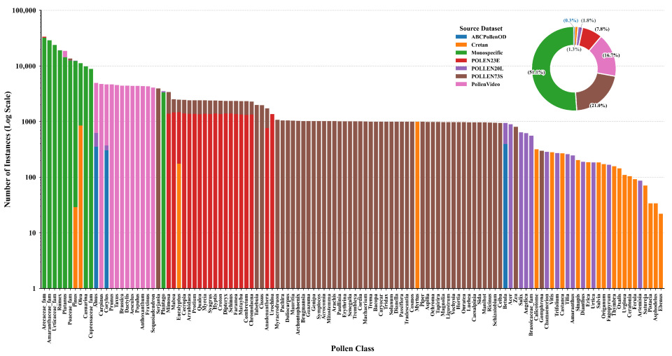 7]. In typical monitoring setups, a trained palynologist can only process on the order of tens of slides per day, which is orders of magnitude below what is required for high-temporal-resolution phenological monitoring and large-scale biodiversity assessments. This limitation forms a critical data bottleneck, hindering our ability to monitor rapid ecological processes such as phenological shifts in response to climate change, the spread of invasive species, or real-time changes in plant biodiversity. Consequently, the development of automated, high-throughput, and high-precision pollen identification technologies has become a pressing demand in the field.