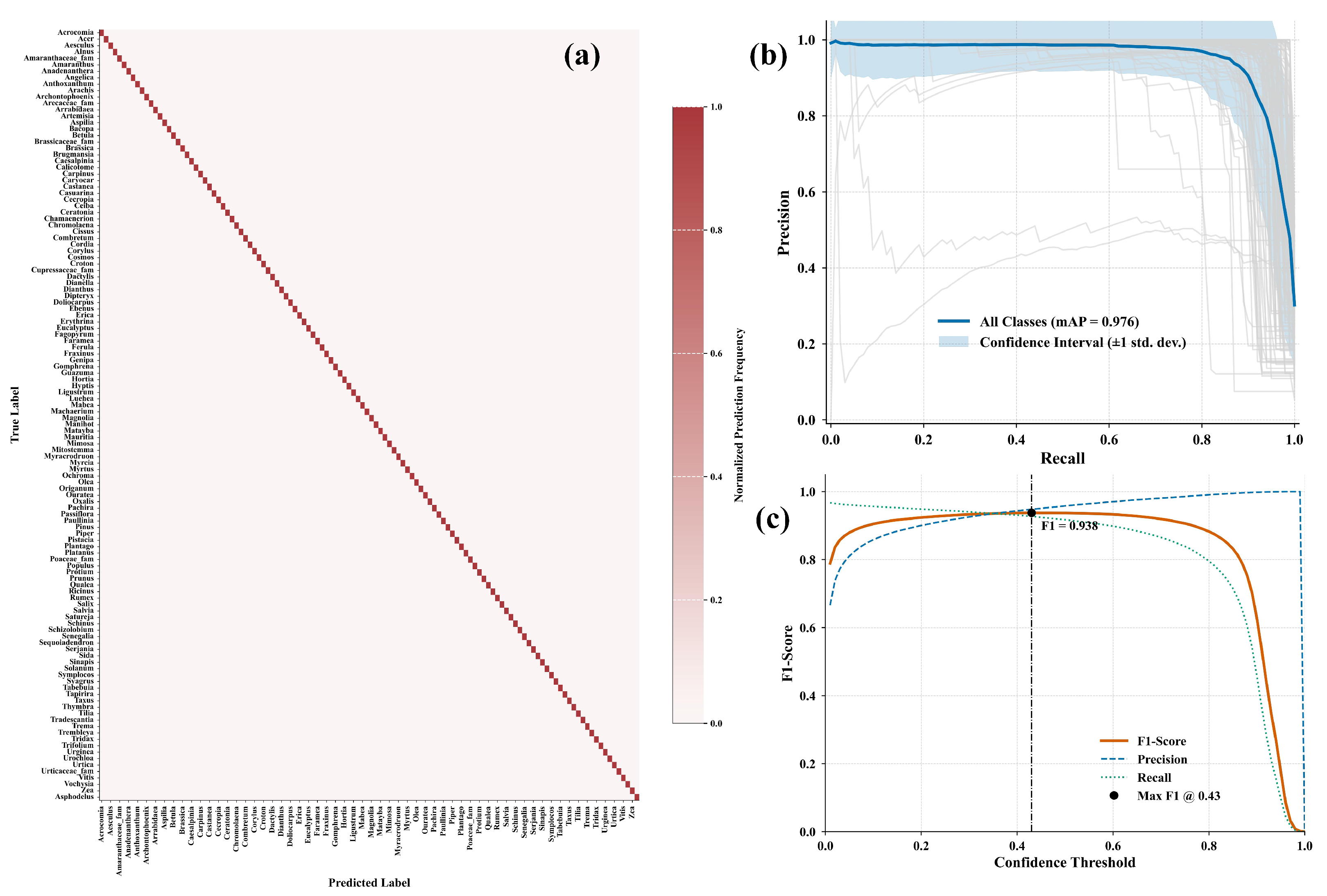 Figure 4a) exhibits a distinct and highly concentrated diagonal, indicating extremely high classification accuracy across the 46 pollen classes with minimal inter-class confusion. The Precision-Recall (P-R) curve (