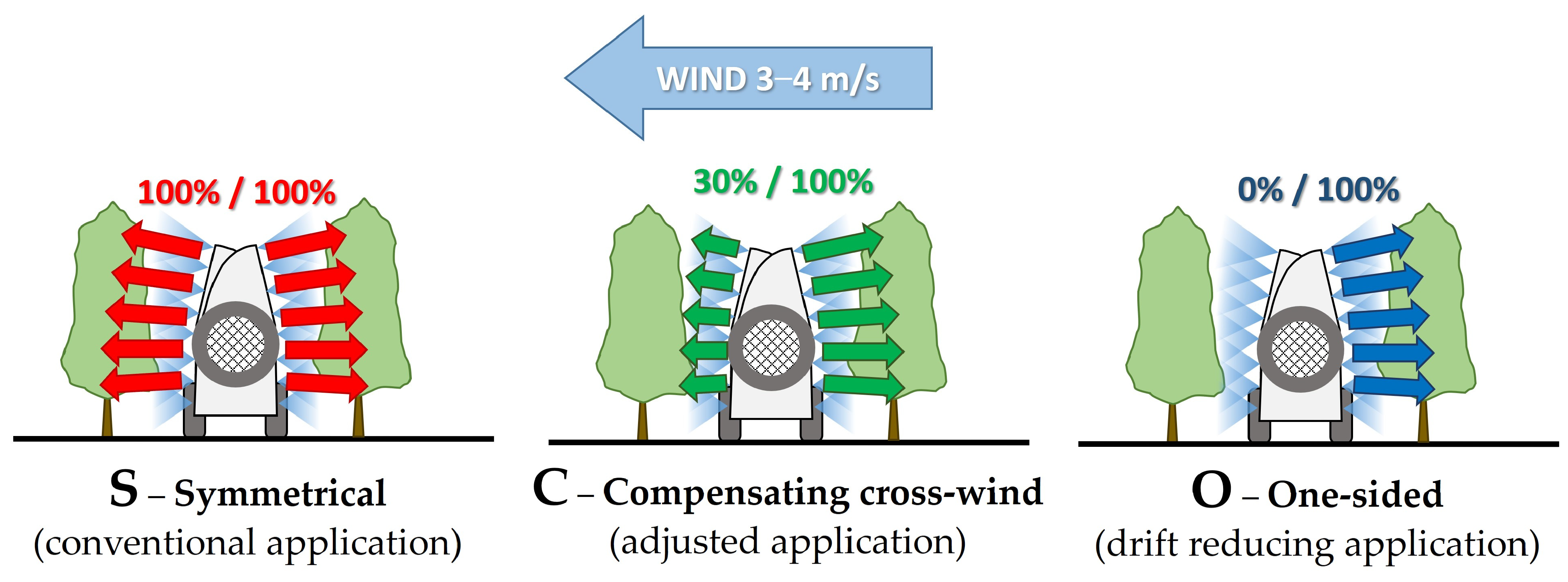 - C—Compensating crosswind: L/R = 30%/100%(compensating for the effects of crosswinds and reducing spray loss);