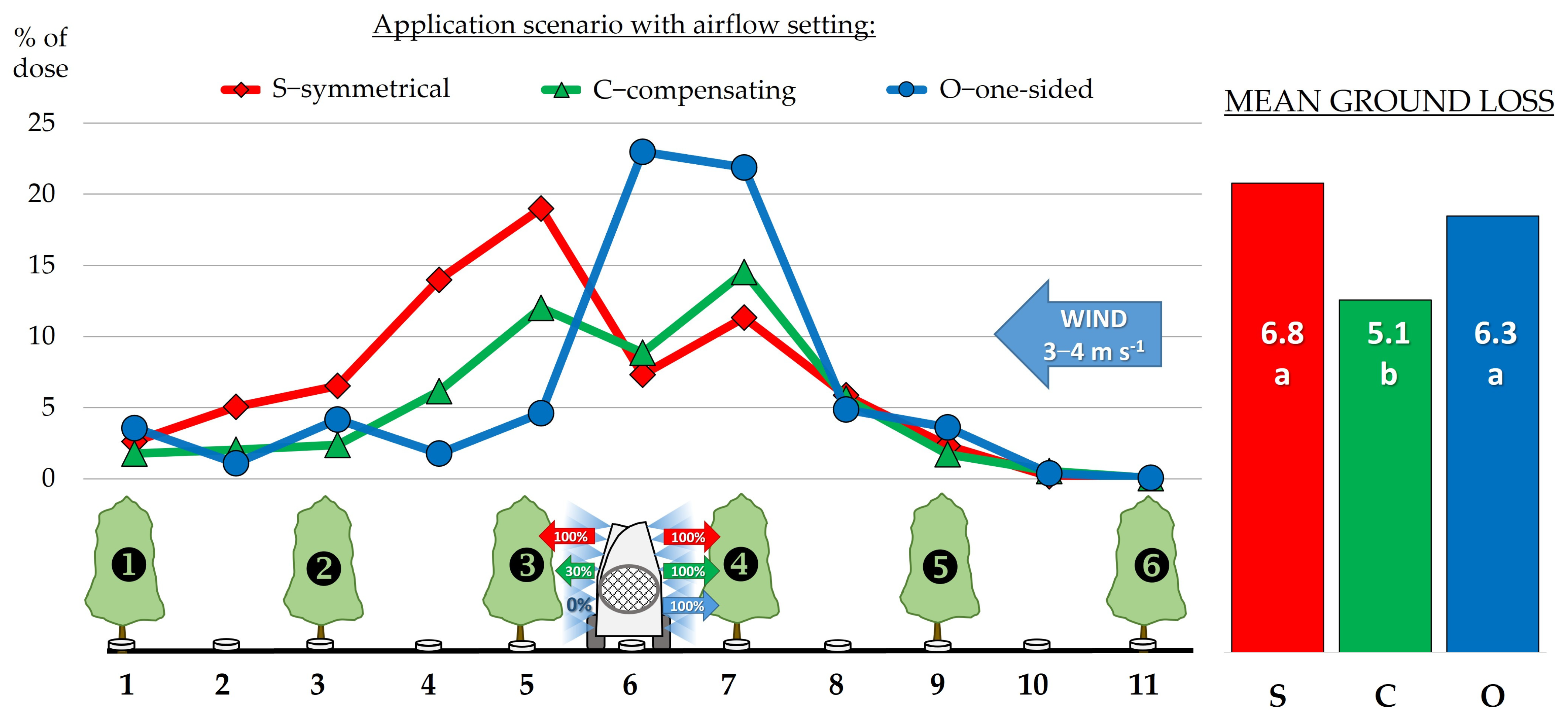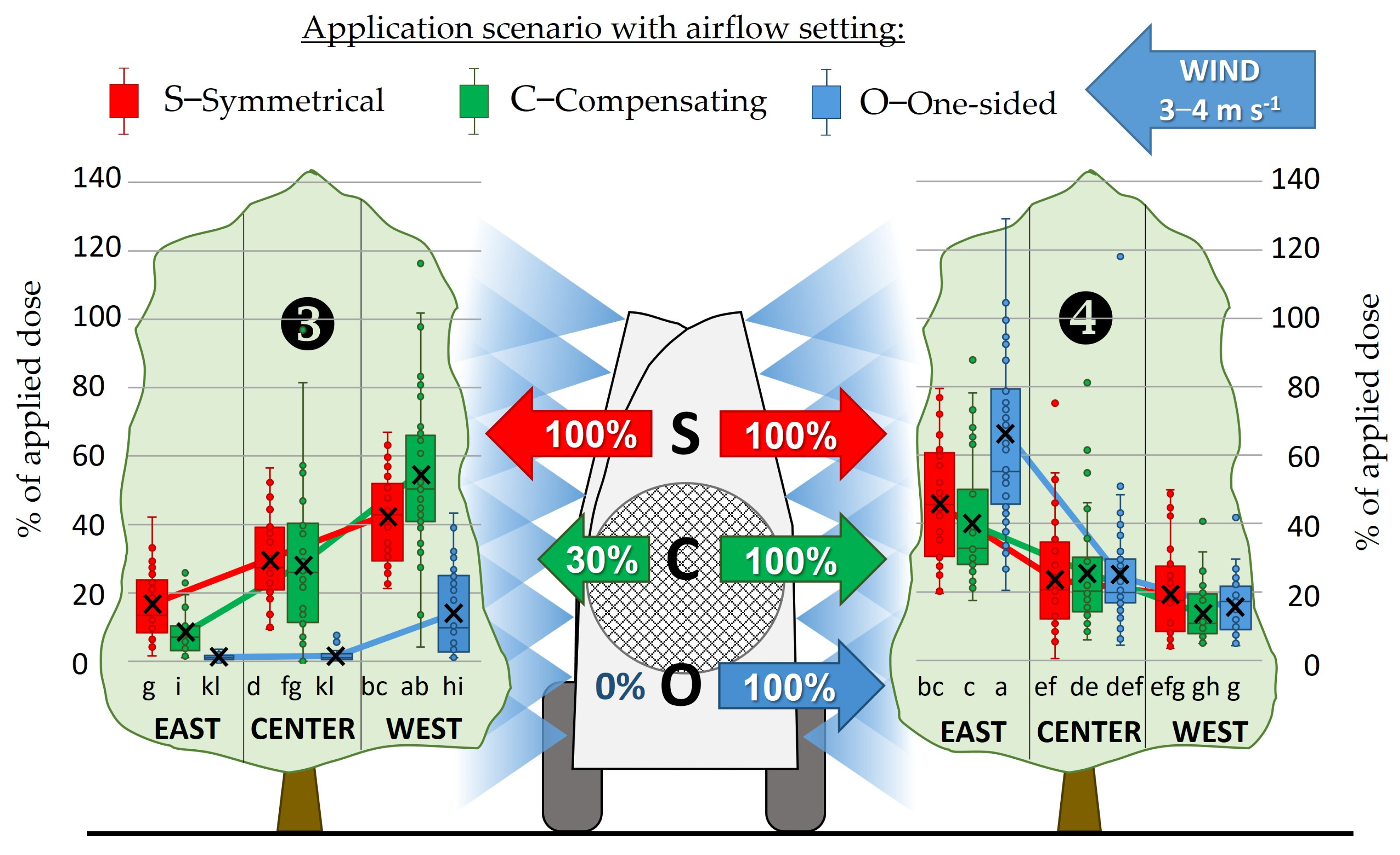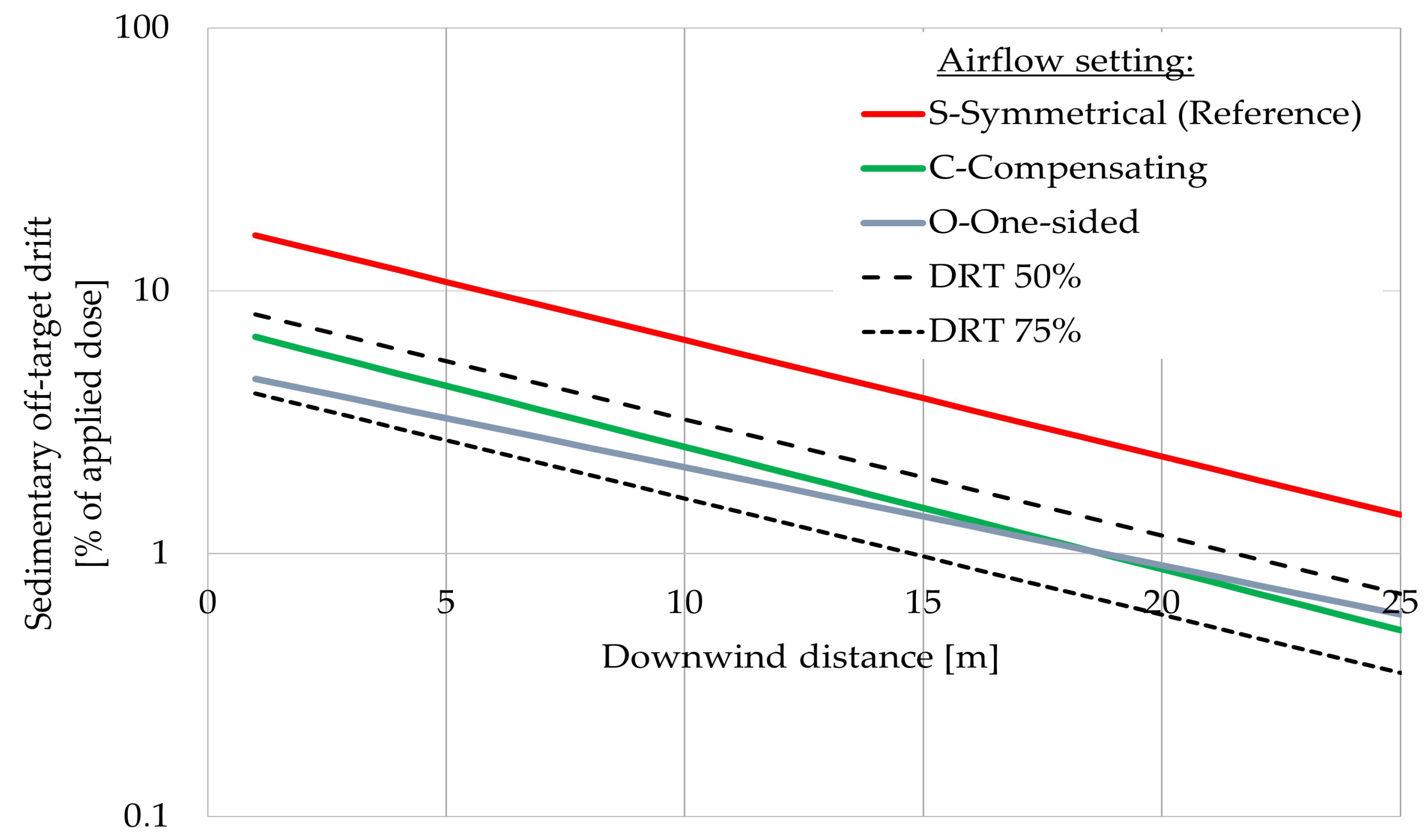 - O—One-sided emission: L/R = 0%/100%(representing spray drift-reducing scenario).