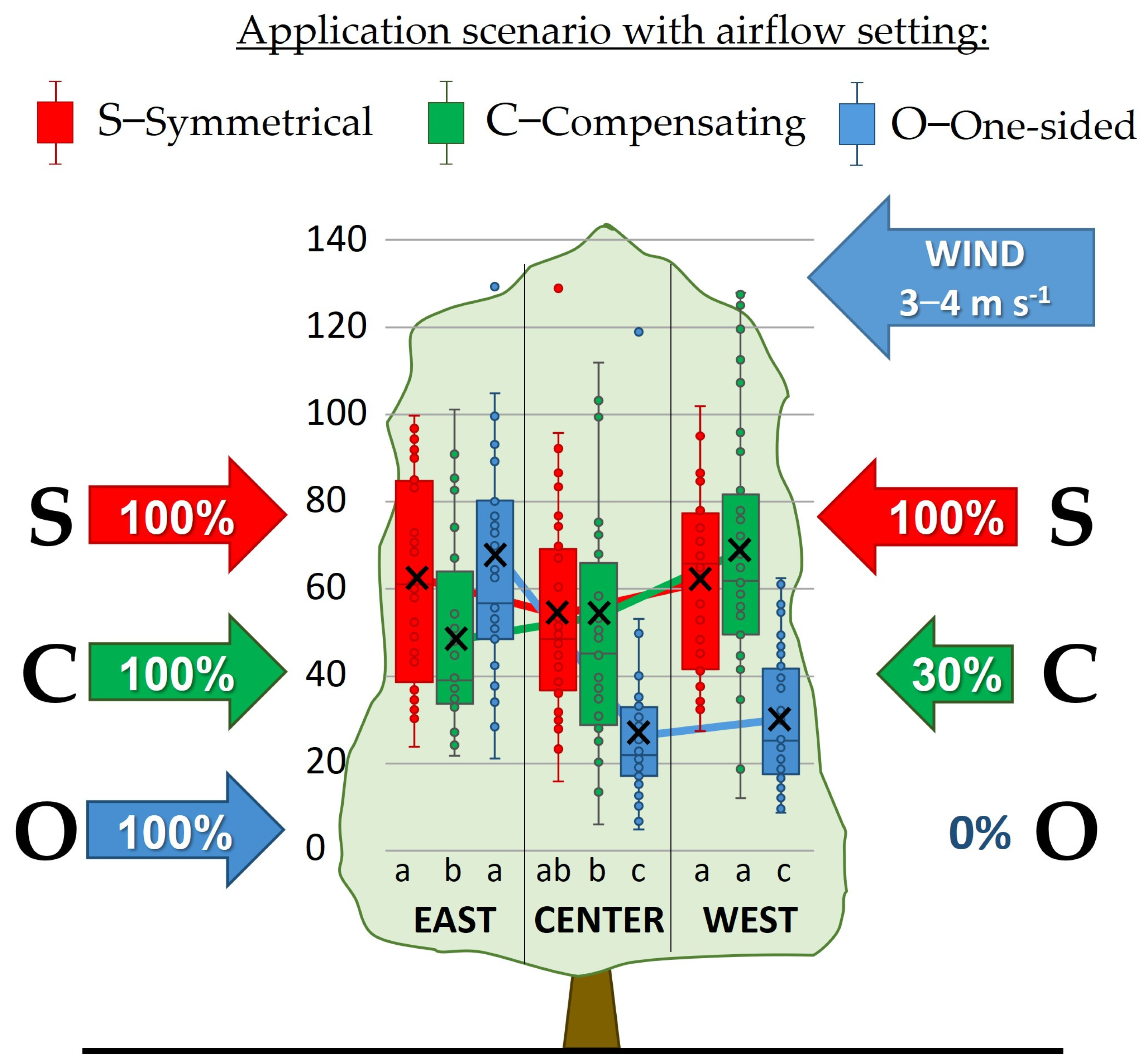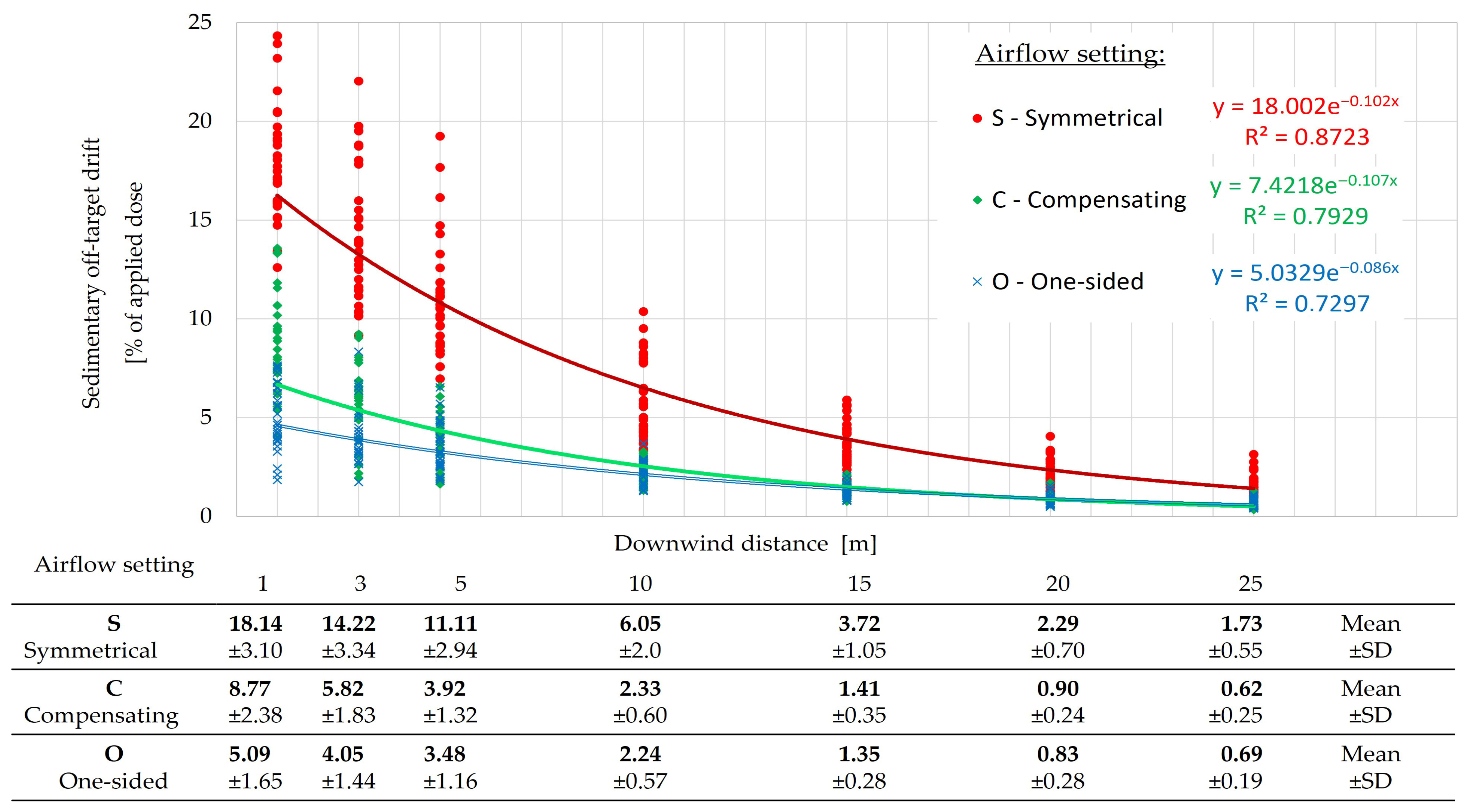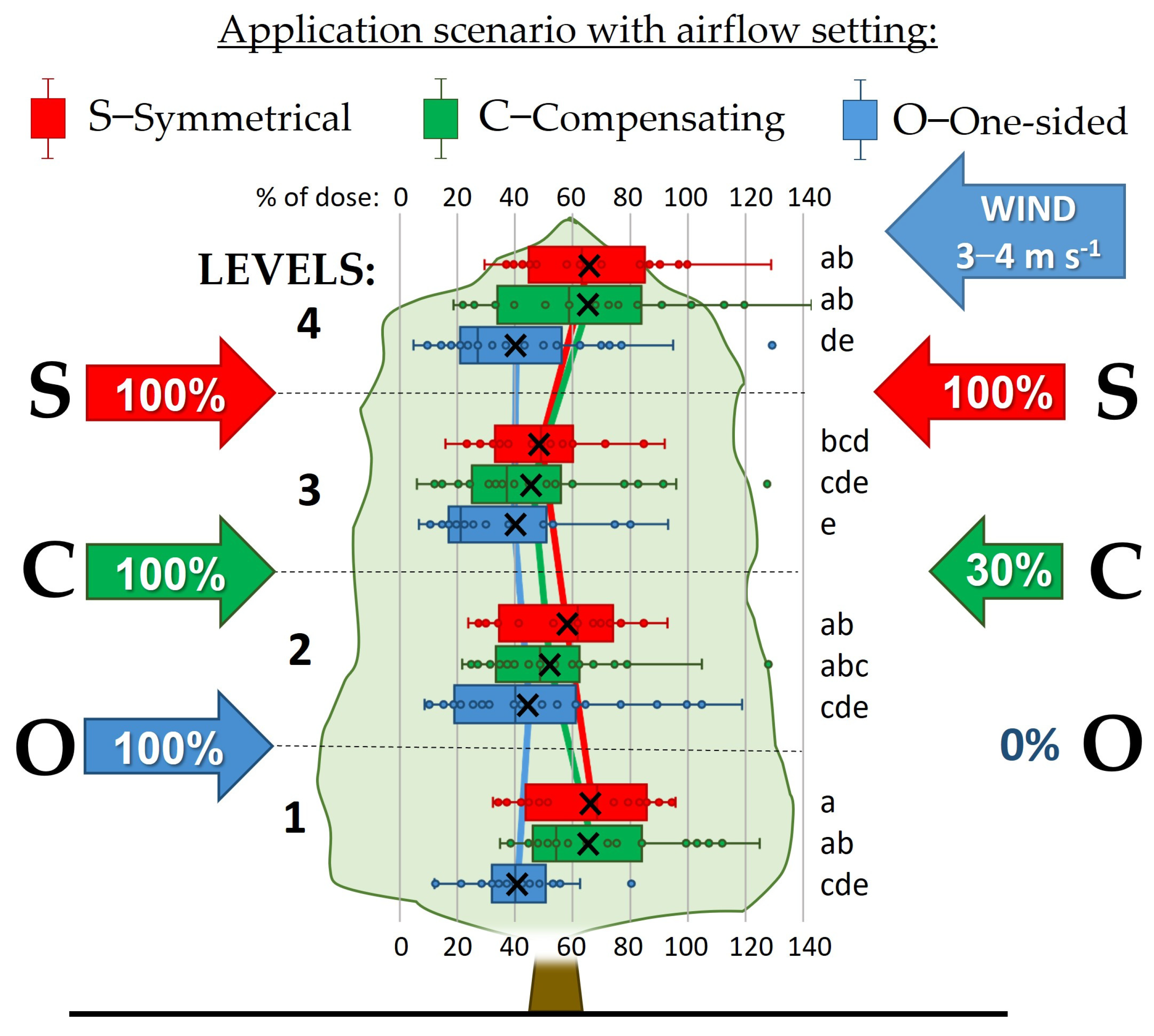 - O—One-sided emission: L/R = 0%/100%(representing spray drift-reducing scenario).