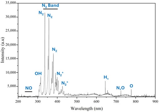 The types and intensities of excited species generated in plasma are typically analyzed using the OES technique. Pin-hole air plasma jet emission was investigated by OES which is employed to monitor plasma in its gaseous state effectively [21]. The primary spectral component observed in the OES spectrum corresponds to the nitrogen spectrum within the 300–500 nm range (Figure 4), as air is used as the working gas in the process. The emission peaks observed between 200 and 900 nm indicated the presence of molecular nitrogen (N2), atomic nitrogen (N), and atomic oxygen (O) in gas phase (not under water). In addition, the presence of peaks of NO, OH, N2, N2+, H, N, and O species was confirmed based on their characteristic optical emission lines at interval 200–300 nm, 302 nm, 337–360 nm, 392–430 nm, 655 nm, 730 nm, and 770 nm, respectively [22,23]. A window is not necessary because spectrometer’s optical fiber can see the plasma directly. OES spectra were acquired through the wall of the borosilicate glass tube, with the fiber optic probe positioned outside and aligned with the luminous plasma volume. Measurements were performed in a darkened room, and dark current and baseline corrections were applied. Although the 200–300 nm NO band is typically observed in air plasmas [24], collection through the borosilicate glass tube substantially reduces this region, yielding a low signal-to-noise ratio. Accordingly, this region is presented qualitatively, with an upper bound on the band integrated NO band intensity. The excitation of nitrogen atoms or ions within plasma leads to light emission at specific wavelengths. As the primary sources of the reactive RNS and ROS, high levels of nitrogen (N) or oxygen (O) significantly influence the formation and concentration of these species [25]. Our plasma setup uses air as the working gas, providing maximum nitrogen concentration [26], which improves overall process efficiency and makes it suitable for various applications.