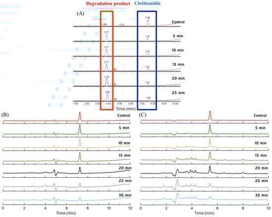 The reactivity and efficacy of our laboratory-made PAW in degrading clothianidin, thiamethoxam, and propoxur were investigated by analyzing the pesticide molecules and their degradation products using HPLC and LC-MS. The PAW solution containing each pesticide was monitored using HPLC at intervals of 0, 5, 10, 15, 20, 25 and 30 min. (Figure 5). As shown in Figure 5A, clothianidin was detected at a retention time of 7.5 min, accompanied by a peak at 3.8 min that is anticipated to be its degradation product. The relative content of clothianidin decreased as the duration of plasma treatment increased, while the relative content of the degradation product increased. This suggests that the degradation of clothianidin is influenced by its interaction with the reactive species present in the PAW. Similarly, PAW was able to drop the concentration of thiamethoxam and propoxur over time (Figure 5B,C). As shown in the HPLC chromatograms (Figure 5), signals appearing before the main peaks of thiamethoxam (7.3 min) and propoxur (5.8 min) become increasingly noticeable with longer plasma treatment times. These early-eluting peaks, which are observed in the region before the primary analyte retention times (1–5 min), are not present in the untreated controls.