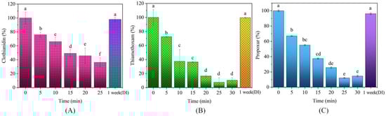 Percentage reductions of clothianidin (A) clothianidin, (B) thiamethoxam, and (C) propoxur over 30 min of treatment using a pin-hole air plasma jet. Lowercase letters indicate significant differences among treatment times (p < 0.05).