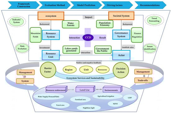 This study is grounded in SES theory [20,26], which posits that social and ecological systems are interdependent, co-evolving complexes. Integrating the life community into the socioecological systems analysis framework (Figure 2), water and forests constitute the critical ecosystems that underpin the survival of resource units. As resource systems, mountains and fields generate and support resource units such as lakes, grasslands, and sands [26]. These units are influenced by the system state and, in turn, constrain the provisioning of services and the sustainability of the system. The core dynamics of this coupled system involve feedback loops: ecological conditions support or constrain social development (e.g., water availability limits agriculture), while social actions (e.g., policies, economic activities) drive ecological change (e.g., land use change, pollution).