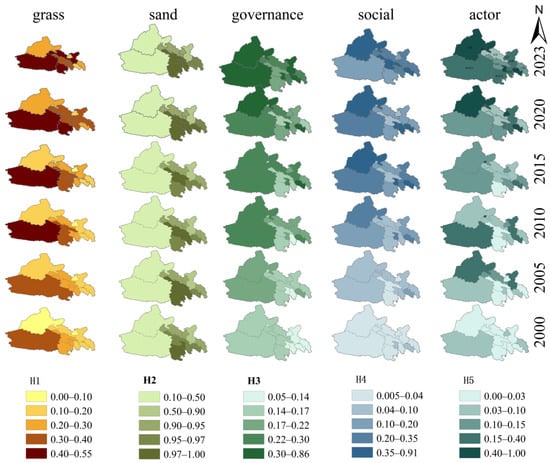 Changes in the assessment indices for the grassland and sand subsystems, and the social, governance, and action subsystems in the study area are shown in Figure 4. The grassland ecosystem showed annual increases across all regions except Lanzhou and Baiyin, which initially rose before slightly declining. High-value areas were concentrated in the southern Qilian Mountains. In the sandy ecosystem, indices fluctuated across cities and prefectures, with lower values in the west and higher values in the southeast. The Social System index improved across all regions, with significant increases in Lanzhou and Xining, pushing them into the high-value range. The Governance System continued to rise in Jiuquan, Jiayuguan, Zhangye, Lanzhou, Haibei, and Hainan, with Lanzhou consistently maintaining the highest level. Xining and Haidong experienced initial increases followed by declines, while Jinchang, Wuwei, Baiyin, and Haixi exhibited fluctuating patterns of “increase-decrease-increase”. The Actor System showed annual growth in Jiayuguan, Haixi, Haibei, and Hainan; Jinchang, Lanzhou, and Haidong experienced initial increases followed by declines; while Jiuquan, Zhangye, and Haixi exhibited a “rise–fall–rise” trend.